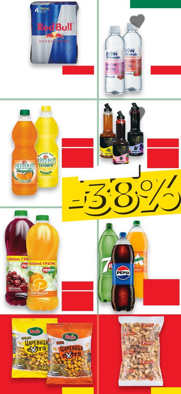 LEMONADES Сироп 1:8 различни вкусове 0,75 л (1 л = 13,32) PRISUN Плодова напитка различни видове 2 л PET (1 л = 0,90) RED BULL Енергийна напитка промопакет 4 х 0,25 л кен ГОРНА БАНЯ Минерална вода 10 л РЕТ (1 л = 0,30) ЕLIT Бадеми сурови 100 г (1 кг = 29,90) SAN BENEDETTO Студен чай различни видове 1,5 л PET (1 л = 1,60)