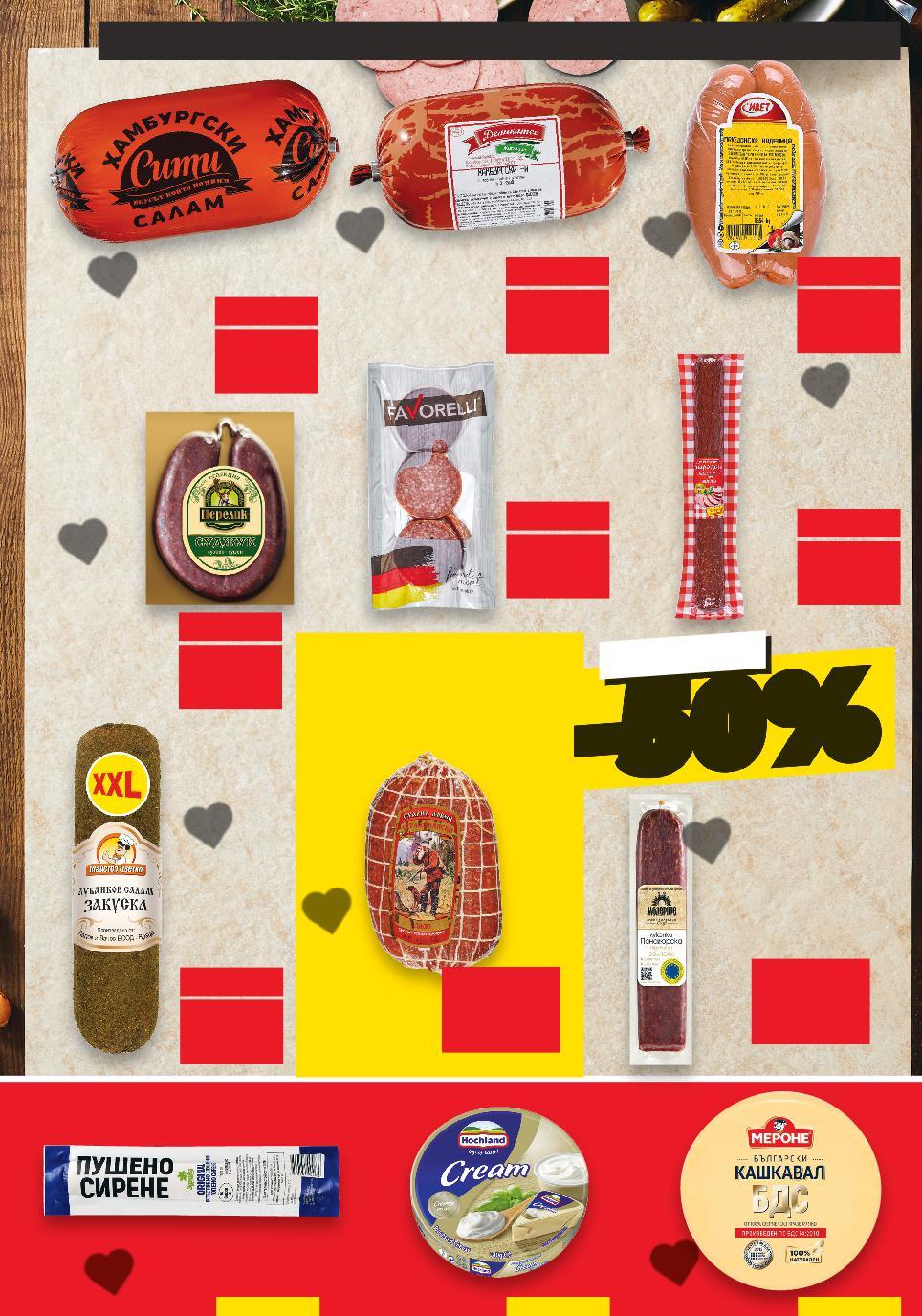 Топено сирене секторно различни вкусове 140 г (1 кг = 23,50) ЗДРАВЕЦ Топено сирене пушено 500 г (1 кг = 11,98) НАРОДЕН Шпек Класик 450 г (1 кг = 17,76) Луканков салам вакуум опаковка около 300 г кг ПЕРЕЛИК Суджук, Бабек, Луканка или Сушеница 160 - 200 г (1 кг = до 31,19) МАЙСТОР ЦВЕТКО Салам Закуска 600 г (1 кг = 17,49) СТАРИЯ ЛОВЕЦ Странджанско дядо вакуум опаковка 600 г (1 кг = 16,65) МОЛЕРИТЕ Луканка Панагюрска 400 г (1 кг = 37,48) СПЕСТИ ДО СПЕСТИ -50% -50% S37-BG-KW24-LFT-SB_2_R-1000-10 37