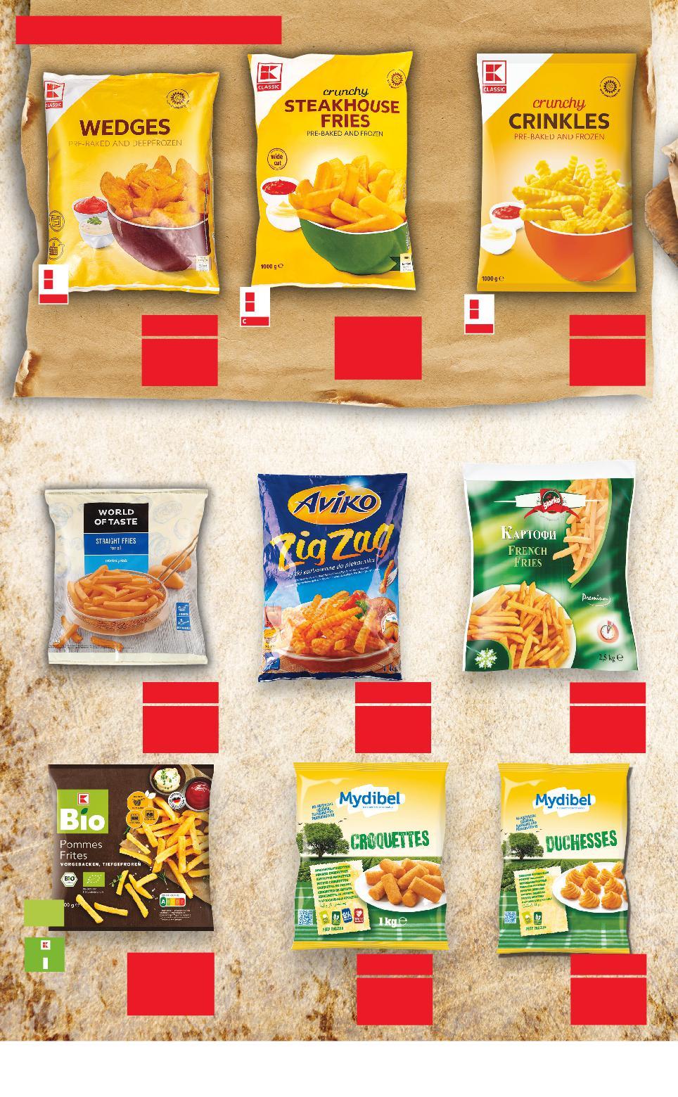 Цените са валидни за посочените на последна страница хипермаркети. Стоките се продават в количества, обичайни за едно домакинство. Всички цени са в лева с включен ДДС. Всички артикули се предлагат без декорация. Снимките са примерни. ПОРЦИЯ КАРТОФИ, МОЛЯ! за кратко при нас -26% 3,29 4,49 -25% 5,99 7,99 -23% 4,99 6,49 -22% 8,99 11,59 -27% 3,99 5,49 3,99* -20% 4,39 5,49 6,99 5,99 -35% -33% 4,49 3,99 Картофи Уеджис пикантни замразени 750 г (1 кг = 4,39) MYDIBEL Картофени крокети или Ноазети замразени 1 кг (1 кг = 4,99) STORKO Бланширани картофи замразени 2,5 кг (1 кг = 3,60) AVIKO Бланширани картофи замразени 1 кг WORLD OF TASTE Картофи замразени различни видове 750 - 1000 г (1 кг = от 3,99) MYDIBEL Картофени дукеси замразени 1 кг Картофи замразени различни видове 1 кг Картофи замразени 600 г (1 кг = 7,49) Картофи Стекхаус замразени 1 кг ПЪРЖЕНИ КАРТОФИ S22-BG-KW24-LFT-POMMES_1_1_L-1000-10 22