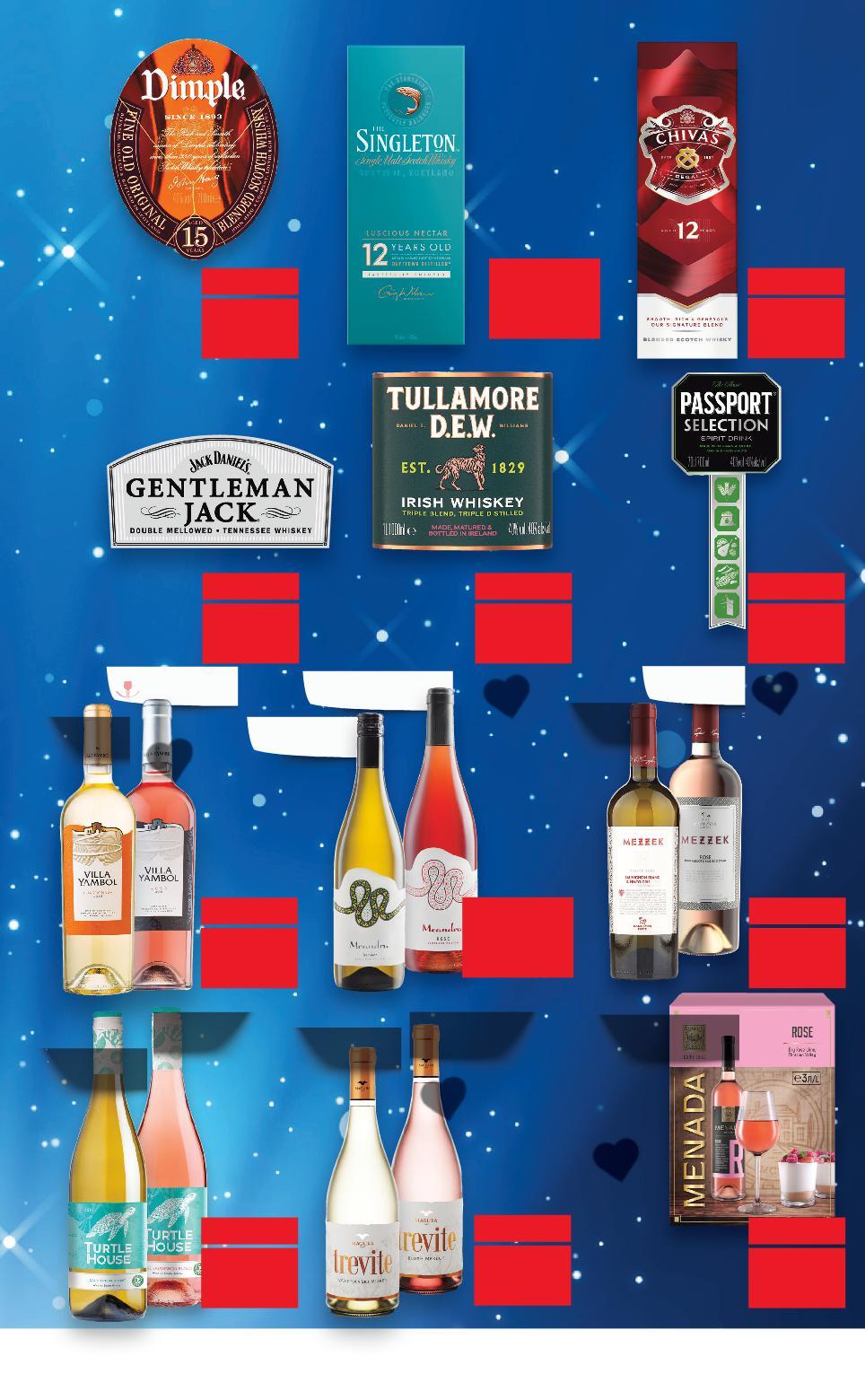 DEW Ирландско уиски 40% vol 1 л GENTLEMAN JACK Tennessee уиски 40% vol 0,7 л (1 л = 68,56) MEZZEK Червено, Бяло вино или Розе различни сортове Тракийска низина 0,75 л (1 л = 13,32)