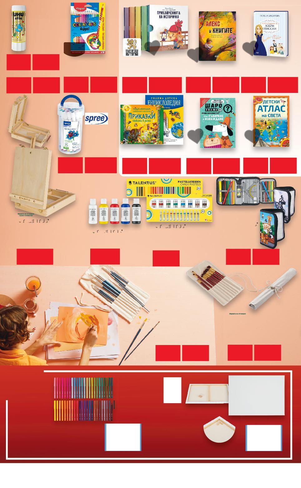 Цените са валидни за посочените на последна страница хипермаркети. Стоките се продават в количества, обичайни за едно домакинство. Всички цени са в лева с включен ДДС. Всички артикули се предлагат без декорация. Снимките са примерни. 8,99 5,99 19,99 6,99 6,99 1,69 2,79 5,99 24,99* 7,99 3,99 6,99* 9,49 11,99 59,99 17,99 -46% 6,99 12,99 -30% 3,49 4,99 12,99 -30% 7,99 -25% 29,99 -33% 8,99 -22% 11,99 -41% 2,99 -43% 4,99 -44% 10,99 -45% 15 броя 48 броя 25 части 13,49 -40% 11,99 -20% 14,99 -20% 74,99 -20% 29,99 -40% Talentus Платно за рисуване 1, 2 или 3 бр. различни видове Talentus Комплект флумастери блестящи Цена с KAUFLAND CARD Цена с KAUFLAND CARD UHU Лепило 8,2 г 21 г Комплект моливи Color Peps 18 цвята Комплект за рисуване със статив, телескопична стойка и дръжка, 27 х 36 х 9 см Несесер с ученически пособия Книга „Детски атлас на света“ Книга различни заглавия Книга различни заглавия Комплект четки за рисуване 9 бр. или 12 бр. Комплект четки за рисуване Комплект бои различни видове Акрилни, Акварелни бои или Пастели Книга „Алекс и книгите“