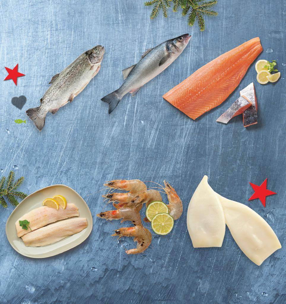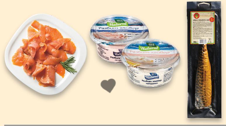 Цените са валидни за посочените на последна страница хипермаркети. Стоките се продават в количества, обичайни за едно домакинство. Всички цени са в лева с включен ДДС. Всички артикули се предлагат без декорация. Снимките са примерни. На последна страница може да видиш дали в твоя Kaufland предлагаме риба и морски деликатеси от витрина с обслужване или на самообслужване. -22% 10,79 13,99 -0% 16,49 само -42% 2,29 3,95 -40% 1,19 1,99 -40% 44,99 75,49 15,99 само 18,99 само 7,49 само 29,99 само Пъстърва изчистена Улов: рибно стопанство в България кг (1 кг = 10,79) Лаврак изчистен Улов: аквакултури в Гърция/Турция фино и сочно месо пресен кг (1 кг = 16,49) Разбит хайвер различни видове 120 г (1 кг = 9,92) Сьомга пушено филе кг (1 кг = 44,99) Калмари туби Улов: див улов в Китай размразени кг (1 кг = 15,99) Сурови скариди размер 30/60 бр./кг Улов: аквакултури в Панама, Еквадор и Куба размразени кг (1 кг = 18,99) Херинга филе Улов: див улов в Исландия размразено кг (1 кг = 7,49) Пушена скумрия 180 г (1 кг = 12,73) Сьомга филе с кожа Улов: аквакултури в Норвегия прясно кг (1 кг = 29,99) РИБНИ ДЕЛИКАТЕСИ РИБА И МОРСКИ ДЕЛИКАТЕСИ съдържа Омега-3 мастни киселини пресен улов от Средиземноморието Прясна екологично чиста американска дъгова пъстърва от стопанството на БЯЛА РЕКА - ВЕЦ ООД S16-BG-KW47-LFT-FIP_L-1000-10 16