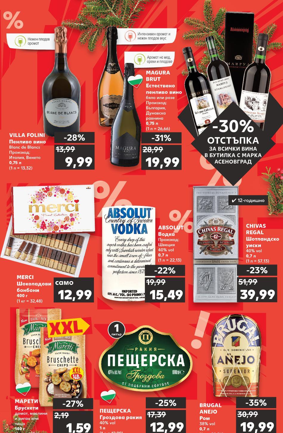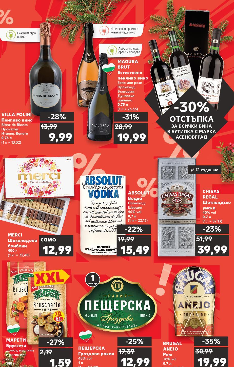 ! *Със звездичка са обозначени артикулите, които са специално предложение до изчерпване на наличностите. Kaufland не носи отговорност за печатни грешки. Аромат на мед, орехи и плодове Нежен плодов аромат Интензивен аромат и нежен плодов вкус Нежен плодов -30% ОТСТЪПКА ЗА ВСИЧКИ ВИНА В БУТИЛКА С МАРКА АСЕНОВГРАД -22% 15,49 19,99 -27% 1,59 2,19 12,99 само -28% 9,99 13,99 -25% 12,99 17,39 -31% 19,99 28,99 -35% 19,99 30,99 -23% 39,99 51,99 ✓ 12-годишно 1 литър VILLA FOLINI Пенливо вино Blanc de Blancs Произход: Италия, Венето 0,75 л (1 л = 13,32) ПЕЩЕРСКА Гроздова ракия 40% vol 1 л (1 л = 12,99) ABSOLUT Водка Произход: Швеция 40% vol 0,7 л (1 л = 22,13) МАРЕТИ Брускети домат, маслини и риган или пица 140 г (1 кг = 11,36) MERCI Шоколадови бонбони 400 г (1 кг = 32,48) MAGURA BRUT Естествено пенливо вино бяло или розе Произход: България, Дунавска равнина 0,75 л (1 л