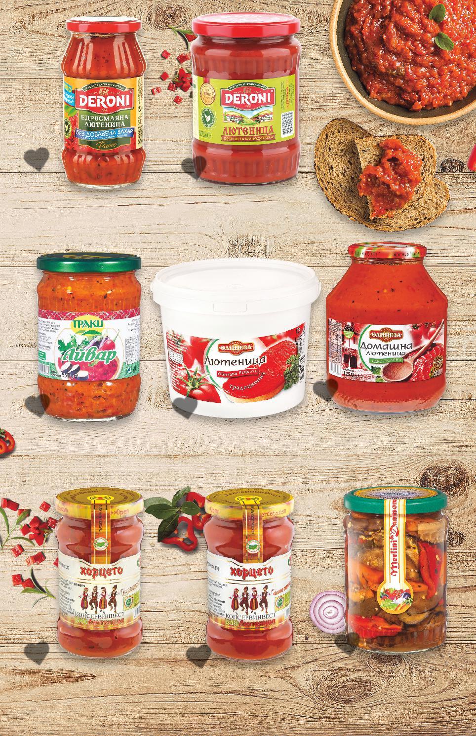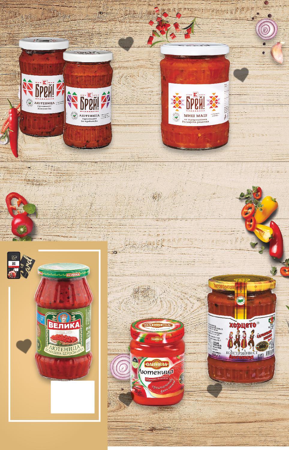 *Със звездичка са обозначени артикулите, които са специално предложение до изчерпване на наличностите. Kaufland не носи отговорност за печатни грешки. -35% 6,49 9,99 -32% 5,49 8,19 -29% 3,79 5,39 -35% 4,99 7,69 5,99 само -26% 12,49 16,99 -27% 5,29 7,25 -18% 3,99 4,89 ОЛИНЕЗА Лютеница традиционна 1400 г (1 кг = 4,64) ХОРЦЕТО Биолютеница едросмляна 300 г (1 кг = 18,30) MERLINI DANIMOND Есенна салата 530 г (1 кг = 7,16) ХОРЦЕТО Биолютеница финосмляна 300 г (1 кг = 16,64) ТРАКИ Айвар с печена капия 550 г (1 кг = 10,90) ОЛИНЕЗА Домашна лютеница едросмляна 1750 г (1 кг = 7,14) DERONI Едросмляна лютеница Финес без добавена захар 510 г (1 кг = 10,38) DERONI Лютеница традиционна, домашна или пикантна 575 г (1 кг = 6,94) 1,4 кг 1,75 кг S21-BG-KW47-LFT-AYVAR_R-1000-10 21