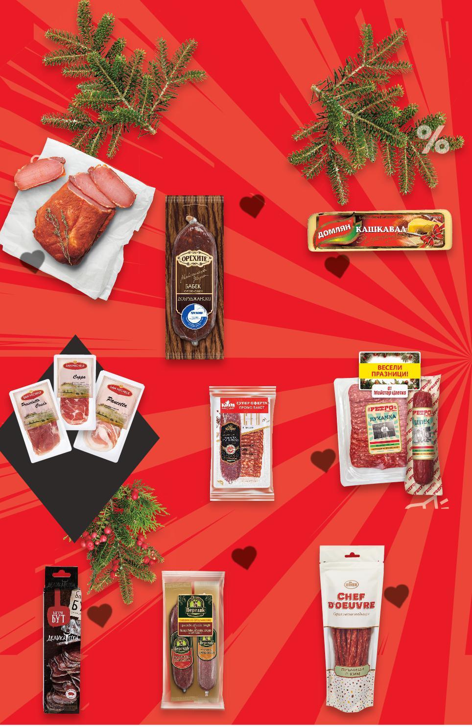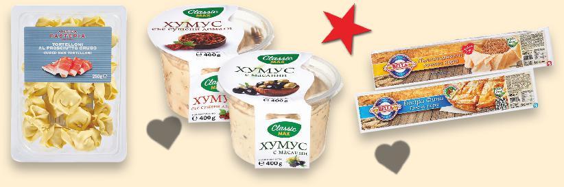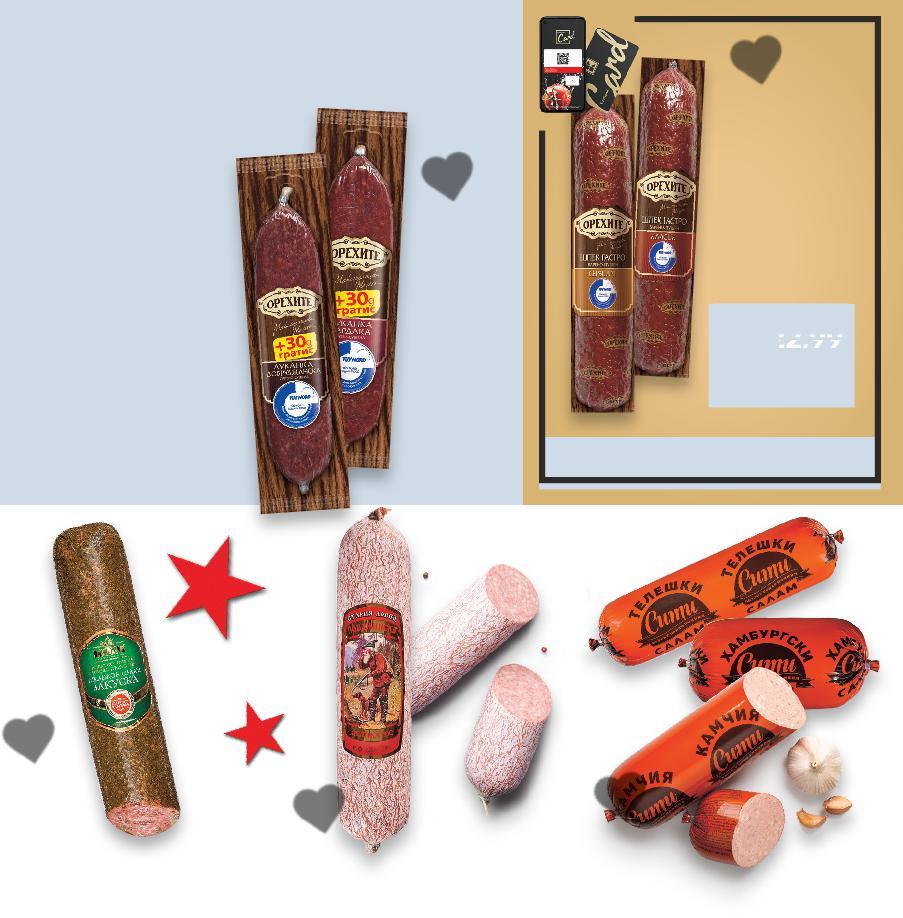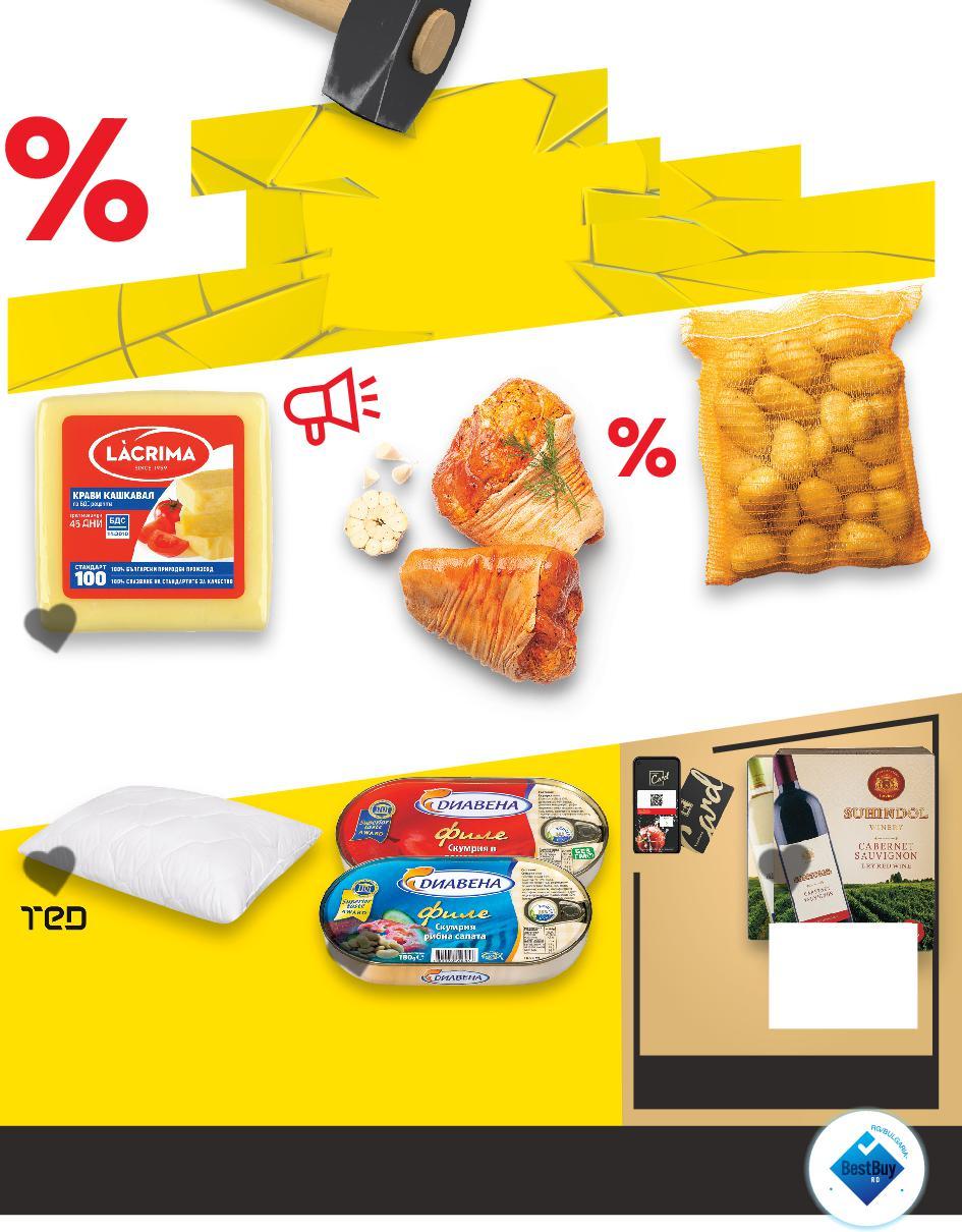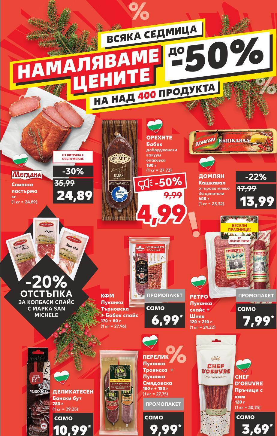 ! Цените са валидни за посочените на последна страница хипермаркети. Стоките се продават в количества, обичайни за едно домакинство. Всички цени са в лева с включен ДДС. Всички артикули се предлагат без декорация. Снимките са примерни. ВСЯКА СЕДМИЦА-50%ДО НАМАЛЯВАМЕ ЦЕНИТЕ НА НАД 400 ПРОДУКТА -20% ОТСТЪПКА ЗА КОЛБАСИ СЛАЙС С МАРКА SAN MICHELE 10,99* само 7,99* само 9,99* само -30% 24,89 35,99 3,69* само 6,99* само -22% 13,99 17,99 -50% 9,99 4,99 ДЕЛИКАТЕСЕН Бански бут 280 г (1 кг = 39,25) РЕТРО Луканка слайс + Шпек 120 + 210 г (1 кг = 24,22) ПЕРЕЛИК Луканка Троянска + Луканка Смядовска 180 г + 180 г (1 кг = 27,75) Свинска пастърма кг (1 кг = 24,89) CHEF D‘OEUVRE Пръчици с ким 120 г (1 кг = 30,75) КФМ Луканка Търновска + Бабек слайс 170 + 80 г (1 кг = 27,96) ДОМЛЯН Кашкавал от краве мляко За ценители 600 г (1 кг = 23,32) ОРЕХИТЕ Бабек добруджански вакуум опаковка 180 г (1 кг = 27,73) ПРОМОПАКЕТ ПРОМОПАКЕТ ПРОМОПАКЕТ S2-BG-KW47-LFT-TOP1_L-1000-10 2