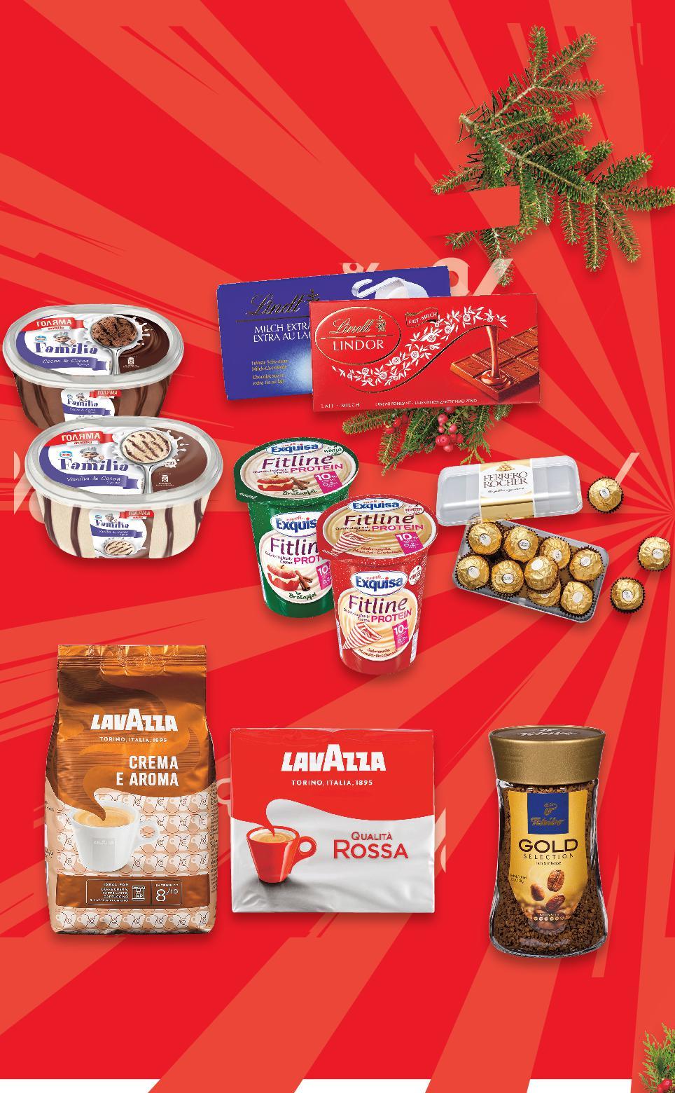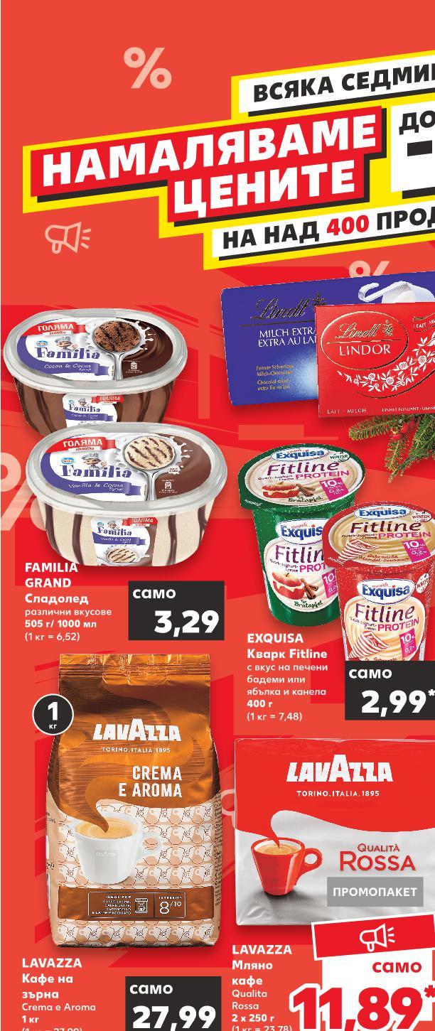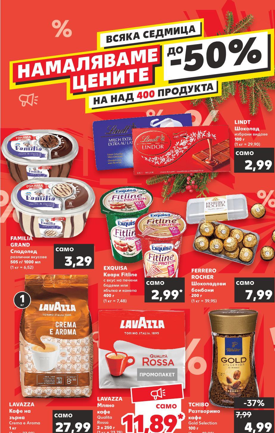 ! Цените са валидни за посочените на последна страница хипермаркети. Стоките се продават в количества, обичайни за едно домакинство. Всички цени са в лева с включен ДДС. Всички артикули се предлагат без декорация. Снимките са примерни. ВСЯКА СЕДМИЦА-50%ДО НАМАЛЯВАМЕ ЦЕНИТЕ НА НАД 400 ПРОДУКТА -37% 4,99 7,99 7,99 само 2,99* само 27,99 само 3,29 само 2,99 само -0% 11,89* само 1 кг FERRERO ROCHER Шоколадови бонбони 200 г (1 кг = 39,95) EXQUISA Кварк Fitline с вкус на печени бадеми или ябълка и канела 400 г (1 кг = 7,48) TCHIBO Разтворимо кафе Gold Selection 100 г (1 кг = 49,90) LAVAZZA Кафе на зърна Crema e Aroma 1 кг (1 кг = 27,99) FAMILIA GRAND Сладолед различни вкусове 505 г/ 1000 мл (1 кг = 6,52) LINDT Шоколад избрани видове 100 г (1 кг = 29,90) LAVAZZA Мляно кафе Qualita Rossa 2 х 250 г (1 кг = 23,78) ПРОМОПАКЕТ S4-BG-KW47-LFT-TOP2_L-1000-10 4