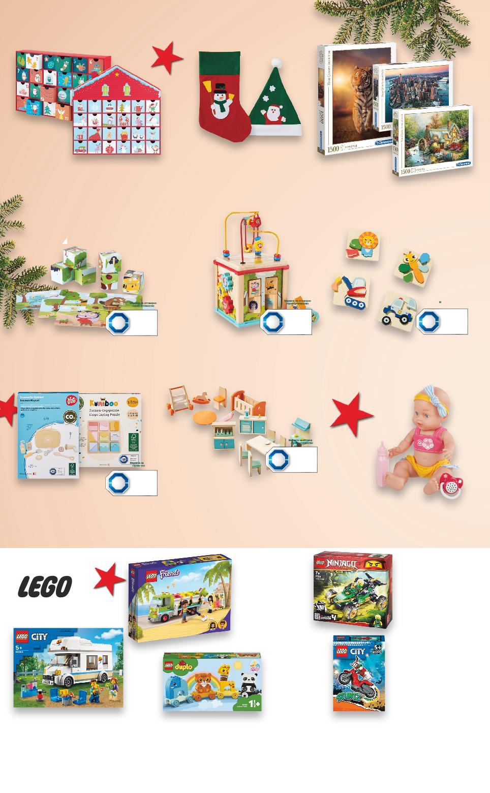 Цените са валидни за посочените на последна страница хипермаркети. Стоките се продават в количества, обичайни за едно домакинство. Всички цени са в лева с включен ДДС. Всички артикули се предлагат без декорация. Снимките са примерни. Коледен календар 24 прозорчета за индивидуално пълнене, картон, различни видове Кукла бебе с биберон с 36 различни звука и бутилки, с фукция пиш-пиш, 30 см Дървена играчка различни видове Дървен пъзел различни видове, 5 или 6 части 24,99* само 14,99* само 3,99* само 24,99* само 2,99* само 17,99* само 6,99 само -33% 11,99 17,99 КЪТ ЗА ИГРИ 3+ 3+ 1+ 9+ 1,5+ 2+ 2+ Пъзел различни мотиви, 1500 части 9,99* само LEGO Конструктор различни видове LEGO Конструктор различни видове -20% 12,79 15,99 -20% 31,99 39,99 -20% 35,99 44,99 -20% 34,99 43,99 -20% 15,99 19,99 Пъзел с кубчета дърво и хартия Активен куб 5в1 дърво, пластмаса и метал, 16 x 16 x 16 см /затворен/ Аксесоари за къща за кукли различни мебели за спалня, дневна, кухня и баня Коледна декорация чорап със снежен човек или Дядо Коледа или шапка със снежен човек или Дядо Коледа за закачване LEGO Конструктор различни видове LEGO Конструктор различни видове LEGO Конструктор различни видове ОТ ПОНЕДЕЛНИК, 21.11.2022 ДО НЕДЕЛЯ, 27.11.2022 S46-BG-KW47-LFT-WEEK_L-1000-10 46