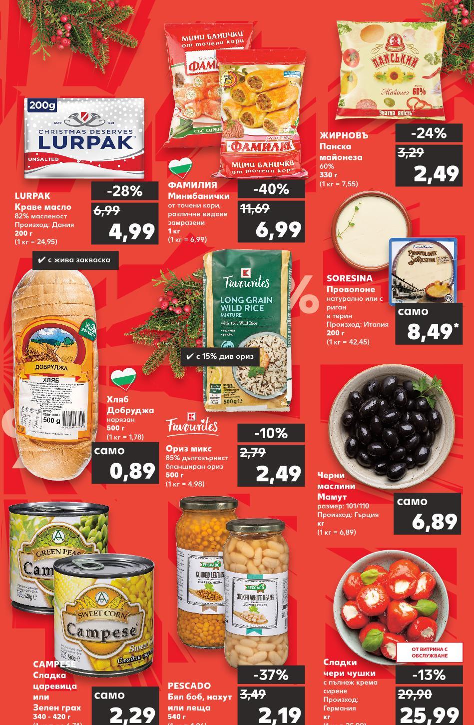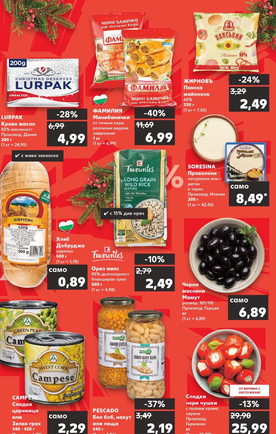 *Със звездичка са обозначени артикулите, които са специално предложение до изчерпване на наличностите. Kaufland не носи отговорност за печатни грешки. -40% 6,99 11,69 -28% 4,99 6,99 6,89 само -13% 25,99 29,90 -24% 2,49 3,29 -37% 2,19 3,49 8,49* само -10% 2,49 2,79 0,89 само ✓ с 15% див ориз ✓ с жива закваска 2,29 само PESCADO Бял боб, нахут или леща 540 г (1 кг = 4,06) SORESINA Проволоне натурално или с риган в терин Произход: Италия 200 г (1 кг = 42,45) CAMPESE Сладка царевица или Зелен грах 340 - 420 г (1 кг = до 6,74) ФАМИЛИЯ Минибанички от точени кори, различни видове замразени 1 кг (1 кг = 6,99) LURPAK Краве масло 82% масленост Произход: Дания 200 г (1 кг = 24,95) Сладки чери чушки с пълнеж крема сирене Произход: Германия кг (1 кг = 25,99) Черни маслини Мамут размер: 101/110 Произход: Гърция кг (1 кг = 6,89) ЖИРНОВЪ Панска майонеза 60% 330 г (1 кг = 7,55) Ориз микс 85% дългозърнест бланширан ориз 500 г (1 кг = 4,98) Хляб Добруджа нарязан 500 г (1 кг = 1,78) S3-BG-KW47-LFT-TOP1_R-1000-10 3