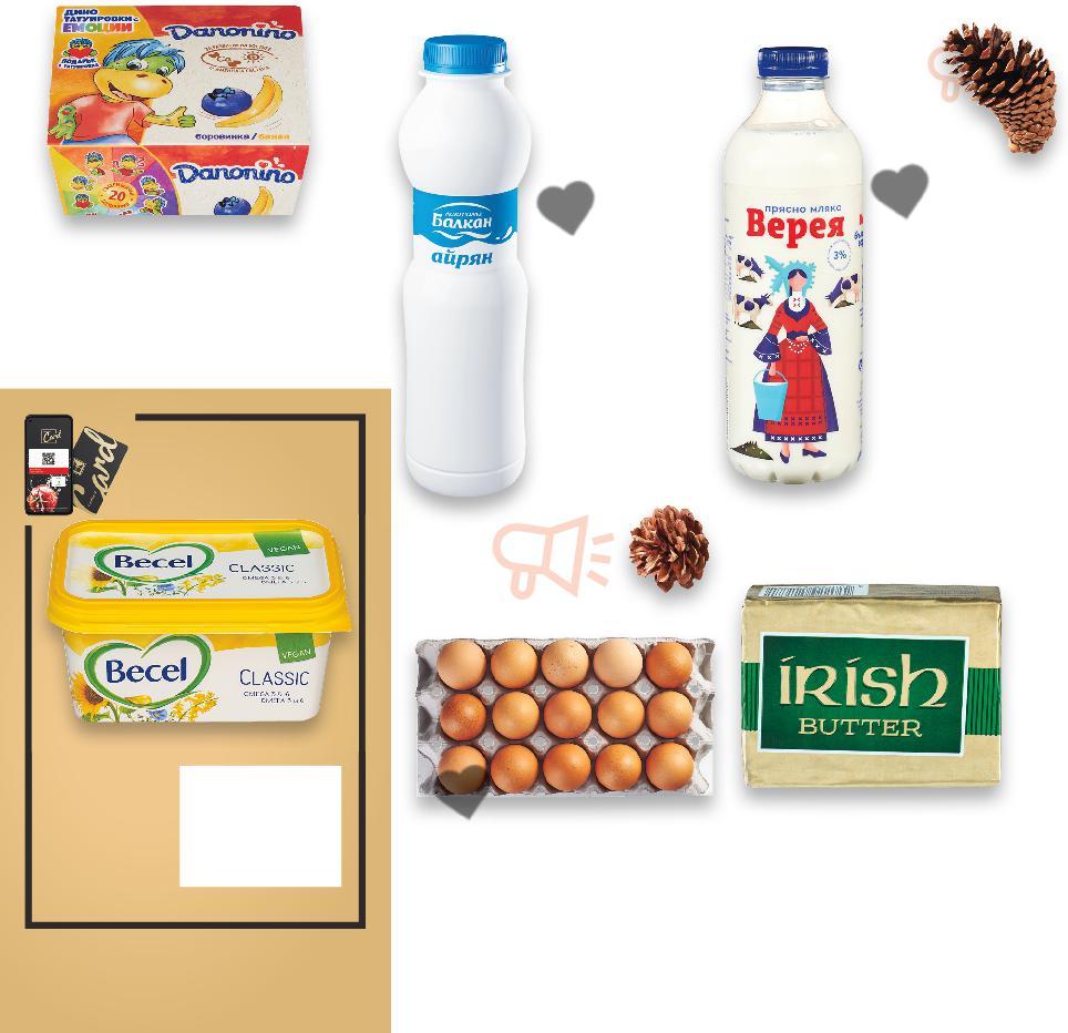 Отстъпката с Kaufland Card e изчислена спрямо стандартната текуща цена, на която продуктът се предлага в хипермаркета. Цените са валидни за посочените на последна страница хипермаркети. Стоките се продават в количества, обичайни за едно домакинство. Всички цени са в лева с включен ДДС. Всички артикули се предлагат без декорация. Снимките са примерни. -25% 1,19 1,59 -28% 4,99 6,99 5,99* само -21% 2,49 3,19 -27% 1,19 1,65 -21% 2,25 2,85 -20% 4,39 5,49 -35% 4,99 7,69 МЛЕЧНИ, РАСТИТЕЛНИ ПРОДУКТИ И ЯЙЦА БУЛГАРЧЕ Кисело мляко 3,6% малсеност 400 г (1 кг = 2,98) Kраве масло 82% масленост Произход: Ирландия 250 г (1 кг = 19,96) АКВИЛОН Кокоши яйца размер М 15 бр. в опаковка (1 бр. = 0,40) ВЕРЕЯ Прясно мляко 3% масленост 1 л (1 л = 2,49) БАЛКАН Айрян 500 мл (1 л = 2,38) DANONE DANONINO Млечен десерт различни вкусове 4 бр. х 50 г (1 кг = 11,25) MY DAY Крем за разбиване Cremio 1 л (1 л = 4,99) ДИМИТЪР МАДЖАРОВ Кисело мляко 4,5% масленост с каймак 1050 г (1 кг = 4,19) -30% 3,79 5,45 само с5,45 амо BECEL Продукт за мазане 400 г (1 кг = 9,48) Цена с KAUFLAND CARD 15 броя S18-BG-KW47-LFT-NMP1_L-1000-10 18