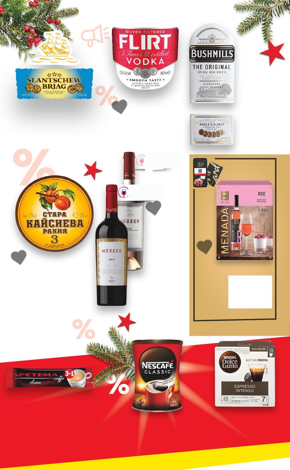 Цените са валидни за посочените на последна страница хипермаркети. Стоките се продават в количества, обичайни за едно домакинство. Всички цени са в лева с включен ДДС. Всички артикули се предлагат без декорация. Снимките са примерни. Аромат на червени дребни плодове на червени плодове Аромат на червени плодове, френски дъб КАФЕ на червени плодове, 14,99 само -29% 8,99 12,79 -51% 0,22 0,45 -26% 13,99 18,99 8,99 само -20% 9,49 11,99 -30% 21,99 31,49 -29% 10,99 15,59 1 литър 3 литра 30 броя -25% 11,99 15,99 амо само NESCAFE DOLCE GUSTO Кафе капсули различни видове 30 бр. 189 - 210 г (1 бр. = 0,50) MEZZEK Червено, бяло вино или Розе различни сортове Произход: България, Тракийска низина 0,75 л (1 л = 11,99) SPETEMA Разтворимо кафе 3 в 1 16,5 г (1 бр. = 0,22) Ракия стара кайсиева, дюлева, или крушова Williams 42% vol 0,5 л (1 л = 27,98) NESCAFE CLASSIC Разтворимо кафе метална кутия 250 г (1 кг = 35,96) SLANTSCHEW BRJAG Спиртна напитка 40% vol 0,7 л (1 л = 13,56) BUSHMILLS ORIGINAL Ирландско уиски 40% vol 0,7 л (1 л = 31,42) FLIRT Водка 37,5% vol 1 л (1 л = 10,99) MENADA Червено, бяло вино или розе различни сортове 3 л BIB (1 л = 4,00) Цена с KAUFLAND CARD ВИНО И ВИСОКОАЛКОХОЛНИ НАПИТКИ Отстъпката с Kaufland Card e изчислена спрямо стандартната текуща цена, на която продуктът се предлага в хипермаркета. S28-BG-KW47-LFT-GEP_L-1000-10 28