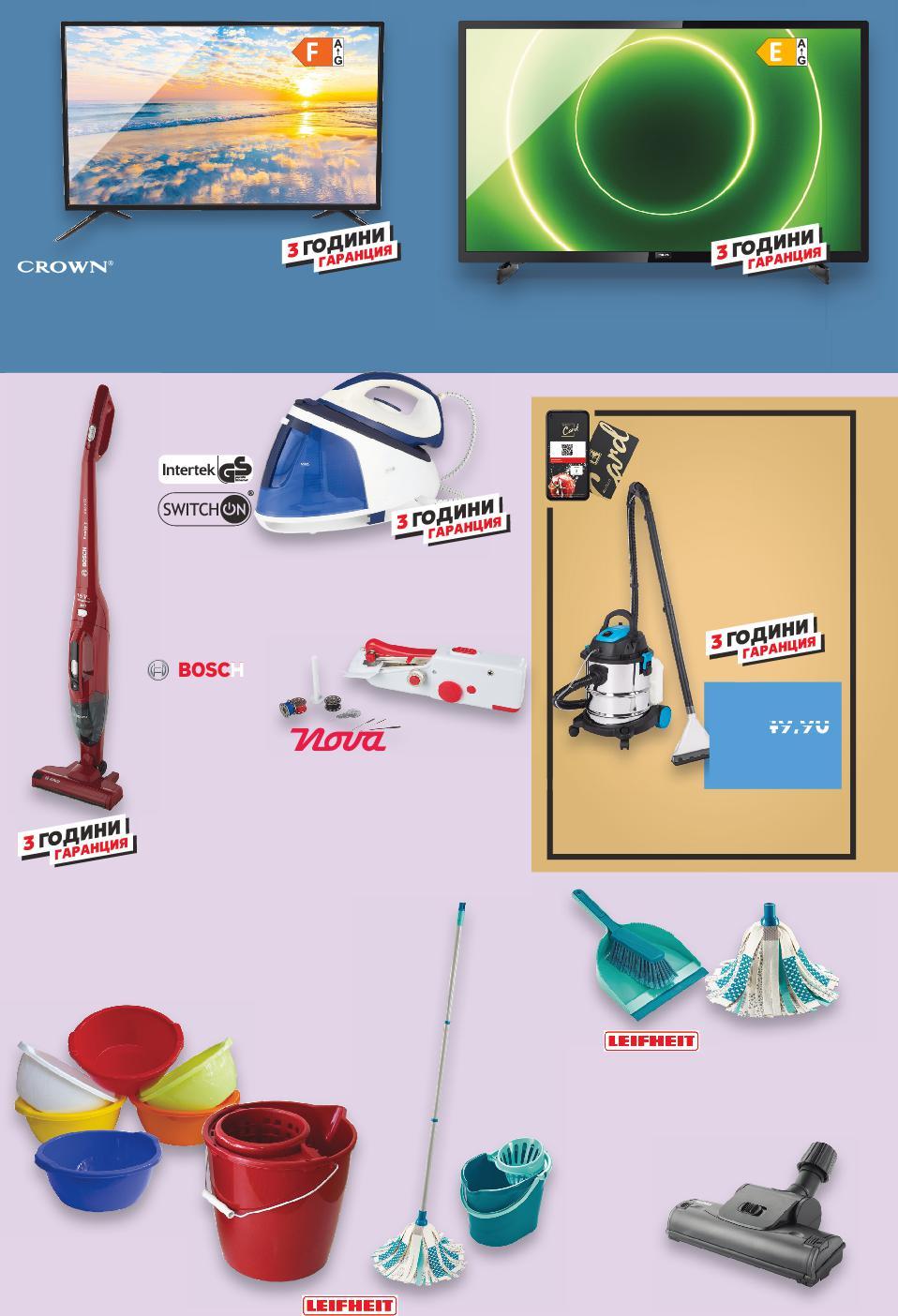 Отстъпката с Kaufland Card e изчислена спрямо стандартната текуща цена, на която продуктът се предлага в хипермаркета. Цените са валидни за посочените на последна страница хипермаркети. Стоките се продават в количества, обичайни за едно домакинство. Всички цени са в лева с включен ДДС. Всички артикули се предлагат без декорация. Снимките са примерни. Oколо81cм32инча Oколо109cм43инча -21% 29,99 38,29 -23% 8,99 11,79 499,90 само 249,90* само 229,90* само 129,90 само 21,99* само 34,99* само -42% 199,90 349,90 само -41% 3,49 5,99 Моп с кофа 3 в 1 Бърсалка за под или Лопатка с четка Турбочетка за прахосмукачка за почистване на килими и мокети, универсална, въртяща се ролка, за тръби 31 - 37 мм Ръчна шевна машина едно ниво на мощност и една настройка на скоростта, с батерии Парогенератор STS-A0301 за сухо и мокро гладене, ударна пара 115 г/мин контейнер за вода 1,8 л налягане 6,5 bar 2200-2400 W Прахосмукачка BCHF2 литиево-йонна батерия до 40 мин работа без зареждане Smart LED LCD телевизор Android, 1366x768 HD Ready, тунер: DVB-T/T2/C/MPEG4, AVI, MP3, JPG, HDMI, SCART, USB плейър Smart LCD LED телевизор 1920 х 1080 FULL HD, YouTube, NetFlix CROWN Прахосмукачка за сухо и мокро почистване, перяща, 1200 W Цена с KAUFLAND CARD ЧИСТО И ПРОСТО БЕЗУПРЕЧНИ Леген 15 л или Кофа с цедка 12 л пластма, различни цветове S42-BG-KW47-LFT-NFP4_L-1000-10 42