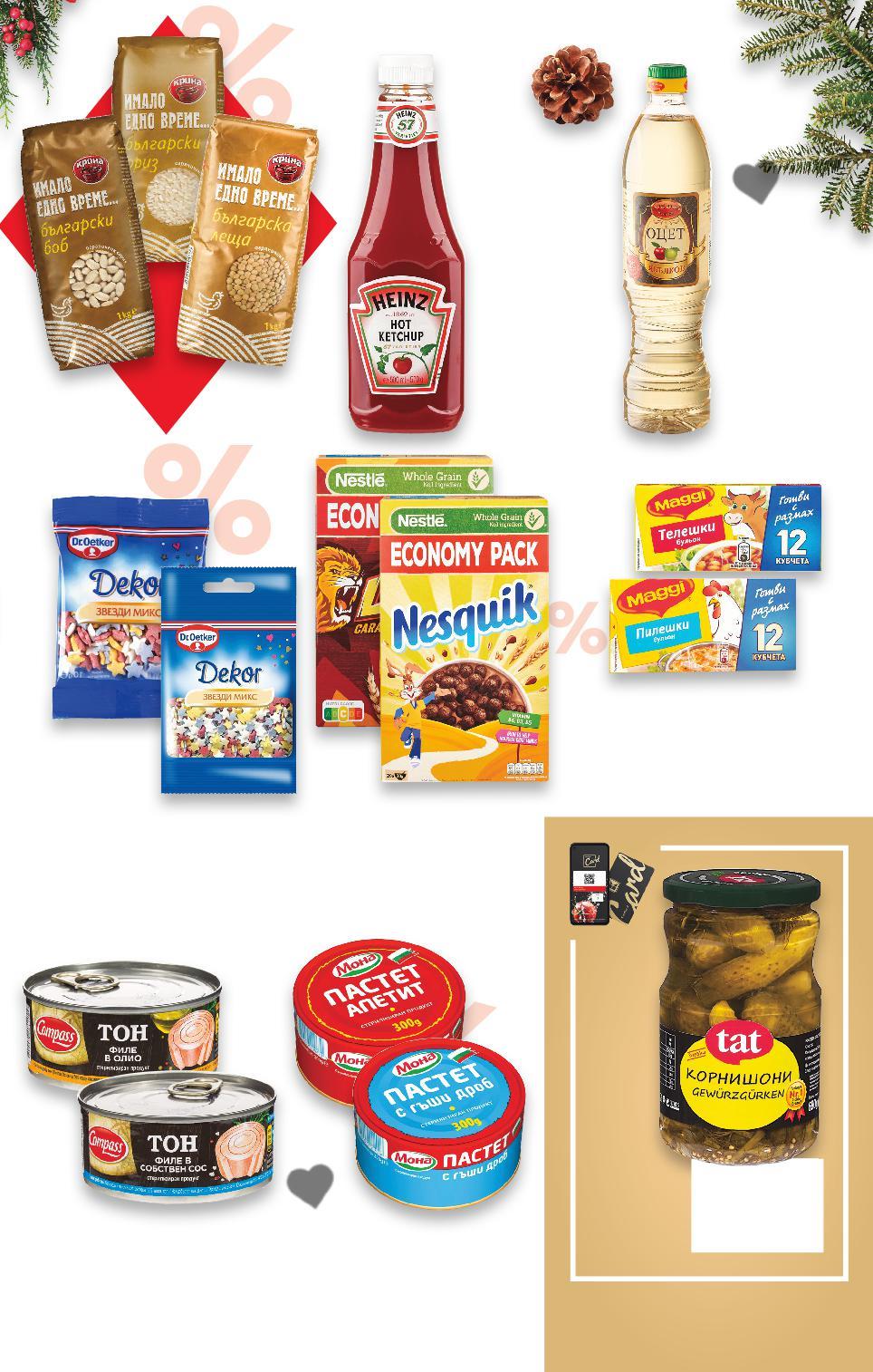 Отстъпката с Kaufland Card e изчислена спрямо стандартната текуща цена, на която продуктът се предлага в хипермаркета. *Със звездичка са обозначени артикулите, които са специално предложение до изчерпване на наличностите. Kaufland не носи отговорност за печатни грешки. -25% ОТСТЪПКА ЗА ПРОДУКТИ КРИНА ИМАЛО ЕДНО ВРЕМЕ -16% 1,49 1,79 -21% 4,49 5,69 -36% 1,39 2,19 -46% 1,59 2,99 -30% 3,29 4,75 -31% 5,99 8,75 -36% 0,79 1,25 ОСНОВНИ ХРАНИ И КОНСЕРВИ VEDA Ябълков оцет 5% 700 мл (1 л = 2,13) HEINZ Кетчуп класик или лют 570 г (1 кг = 7,88) MAGGI Бульон зеленчуков, пилешки или телешки ребърца 120 г (1 кг = 11,59) МОНА Пастет с гъши дроб или Апетит 300 г (1 кг = 5,30) COMPASS Риба тон филе в собствен сос или в олио 160 г (1 кг = 20,57) NESTLE Зърнена закуска различни видове 600 - 625 г (1 кг = от 9,59) DR. OETKER Декорация за торти и сладкиши различни видове 10 г (1 кг = 79,00) -30% 2,29 с3,29 3,29 амо TAT Корнишони 680 г (1 кг = 3,37) Цена с KAUFLAND CARD S19-BG-KW47-LFT-NMP1_R-1000-10 19