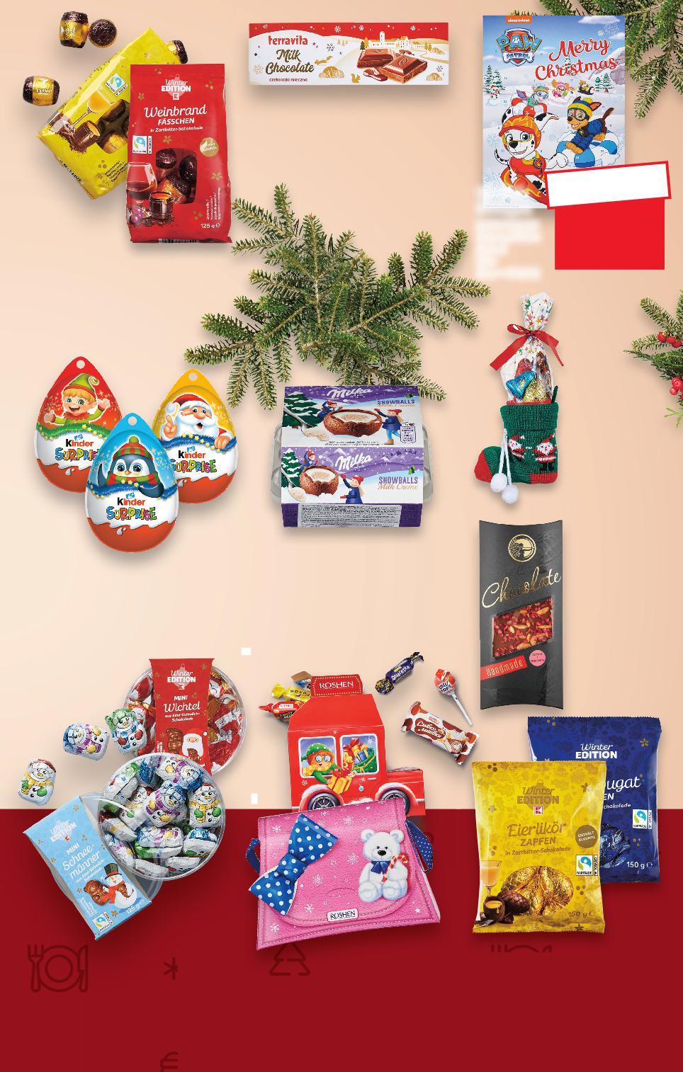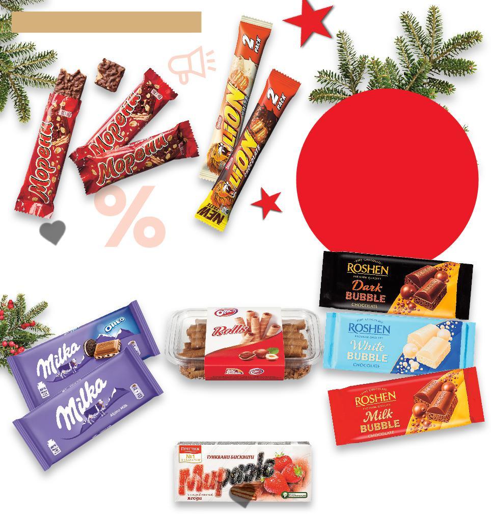 НАД 170 КОЛЕДНИ ЛАКОМСТВА ЩЕ НАМЕРИШ ПРИ НАС *Със звездичка са обозначени артикулите, които са специално предложение до изчерпване на наличностите. Kaufland не носи отговорност за печатни грешки. ръчно приготвен -32% 2,69 3,99 -29% 2,39 3,39 -33% 5,99 8,99 -28% 3,99 -30% 6,99 9,99 5,59 -27% 4,99 6,89 -34% 1,49 2,29 -30% 3,49 4,99 -33% 2,99 4,49 -35% 2,59 3,99 TERRAVITA Млечен шоколад 225 г (1 кг = 11,96) Шоколадови бъчвички черен шоколад с яйчен ликьор или алкохол 125 г (1 кг = 19,12) ROSHEN Коледни лакомства Автобус или Чанта 294 - 298 г (1 кг = от 20,11) Шоколадови фигурки коледни минимум 33% какаова маса различни видове 125 г (1 кг = 31,92) WINDEL Коледен чорап с лакомства 102 г (1 кг = 68,53) MILKA Снежни топки млечен шоколад с млечен пълнеж или с Oreo крем 4 x 28 г (1 кг = 44,56) KINDER SURPRISE Шоколадово яйце с отвор за закачване като играчка за елха 20 г (1 кг = 74,50) LUCZNICZKA Шоколад млечен с бадеми и малини или тъмен с бадеми и череши 100 г (1 кг = 34,90) Шоколадови шишарки с яйчен ликьор или с нуга 150 г (1 кг = 19,94) WINDEL Коледен календар Pets или Paw Patrol 75 г (1 кг = 34,54) S27-BG-KW47-LFT-WS2_R-1000-10 27