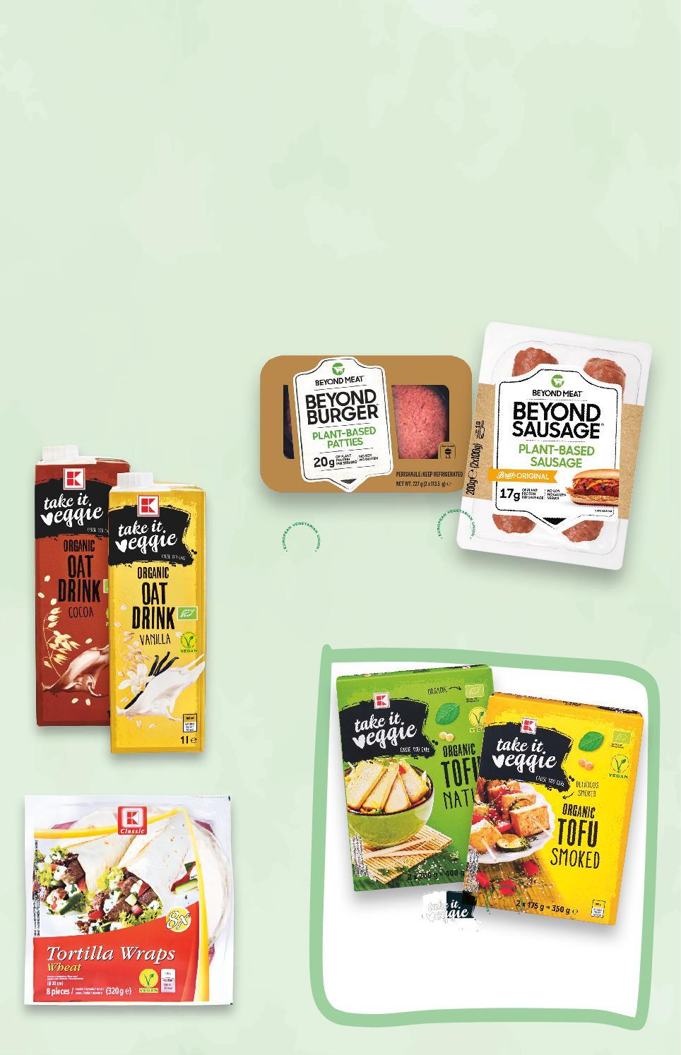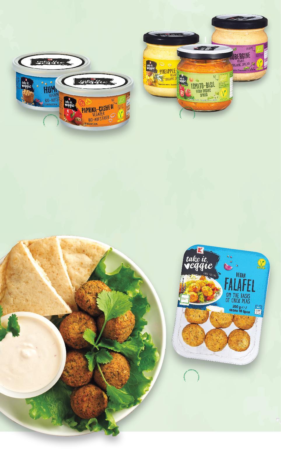 Стоките се продават в количества, обичайни за едно домакинство Всички цени са в лева с включен ДДС Всички артикули се предлагат без декорация Снимките са примерни н ВЕГАН РАЗНООБРАЗИЕ С K-TAKE IT VEGIE -20% 3,19 3,99 -28% 3,19 4,49 -13% 2,49 2,89 K-TAKE IT VEGGIE Вегански биопастет различни видове 180 г (1 кг = 17,73) K-TAKE IT VEGGIE Фалафели 200 г (1 кг = 15,95) K-TAKE IT VEGGIE Биопастет различни видове 125 г (1 кг = 19,92) S2-BG-KW01-CL1-Pano1_L-1000-10 2