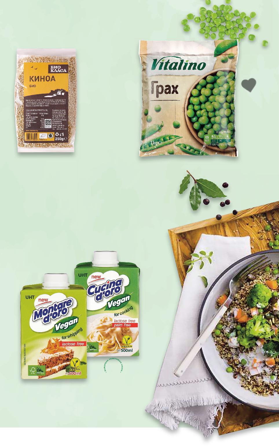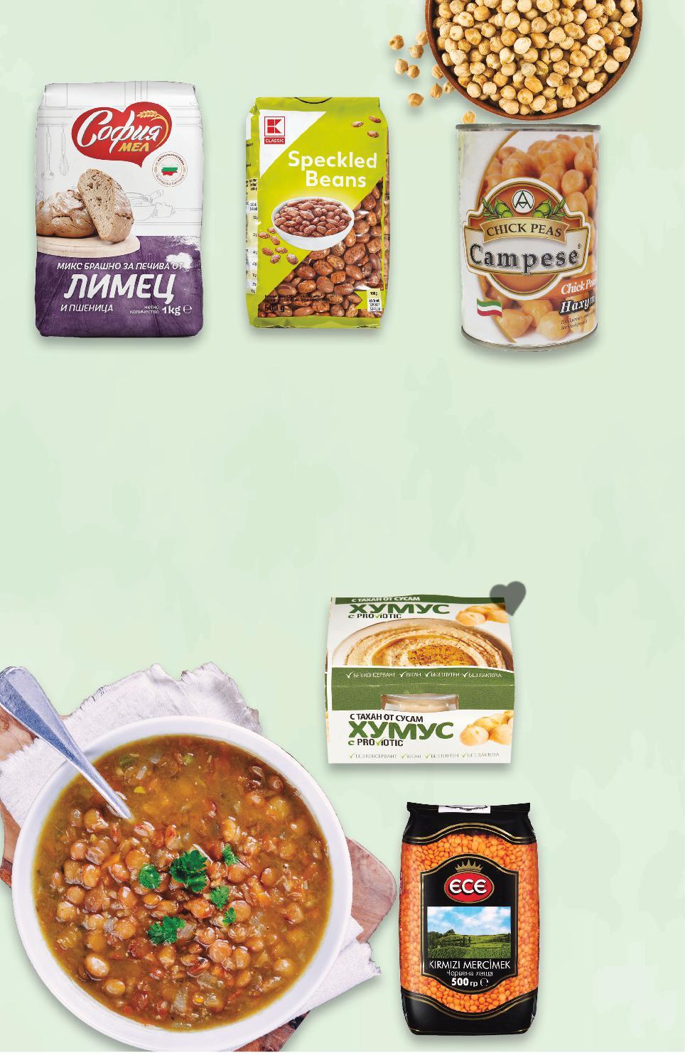 Стоките се продават в количества, обичайни за едно домакинство. Всички цени са в лева с включен ДДС. Всички артикули се предлагат без декорация. Снимките са примерни. -13% 1,89 2,19 -36% 3,49 5,49 -26% 2,49 3,39 2,59 само -25% 2,99 3,99 Боб шарен 500 г (1 кг = 3,78) ЕСЕ Червена леща 500 г (1 кг = 6,98) Хумус с веган пробиотик ProViotic без глутен и лактоза без консерванти 200 г (1 кг = 12,45) CAMPESE Нахут 400 г (1 кг = 6,48) СОФИЯ МЕЛ Брашно лимец и пшеница 1 кг (1 кг = 2,99) ДОМАШНО ВЕГАН МЕНЮ 10 S10-BG-KW01-CL1-Pano5_L-1000-10 10