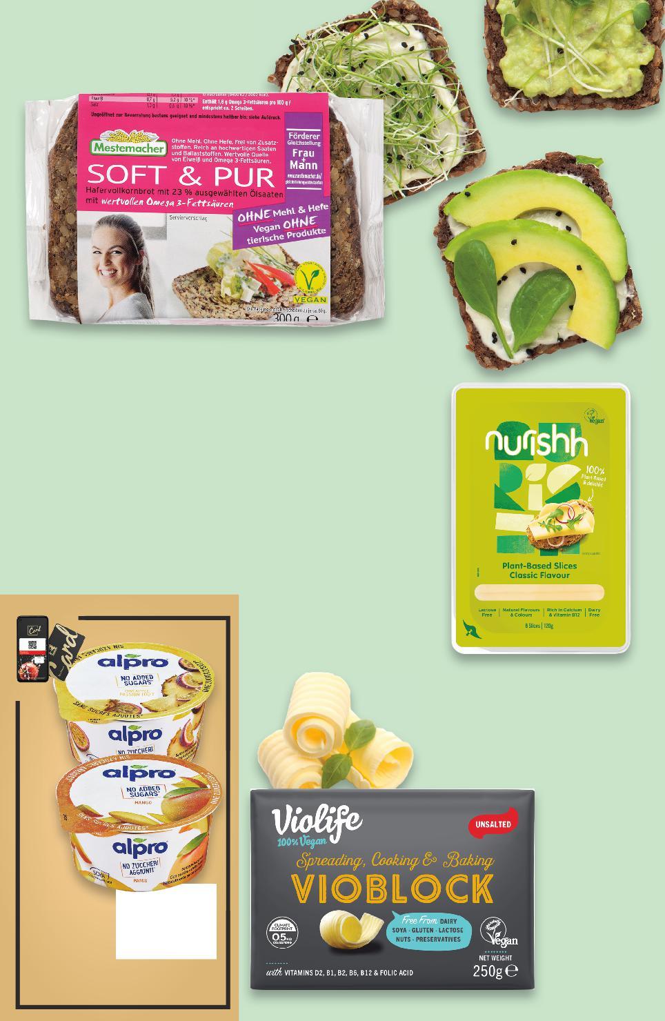 Отстъпката с Kaufland Card e изчислена спрямо стандартната текуща цена, на която продуктът се предлага в хипермаркета. Стоките се продават в количества, обичайни за едно домакинство. Всички цени са в лева с включен ДДС. Всички артикули се предлагат без декорация. Снимките са примерни. ВЕГАН ЗАКУСКА -20% 3,99 4,99 -27% 3,99 5,49 -38% 3,99 6,49 -20% 1,99 2,49 само с2,49 амо MESTEMACHER Пълнозърнест хляб Веган или Фитнес 300 - 500 г (1 кг = до 13,30) NURISHH Веган продукт класик или мента слайс Произход: Франция 120 г (1 кг = 33,25) VIOLIFE Веган продукт за мазане Vioblock или Viospread 79% масленост 250 г (1 кг = 15,96) ALPRO Ферментирал соев продукт различни видове 135 г (1 кг = 14,75) Цена с KAUFLAND CARD S8-BG-KW01-CL1-Pano4_L-1000-10 8