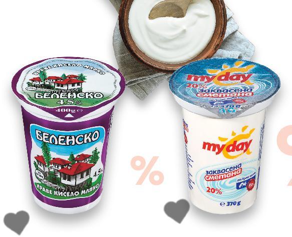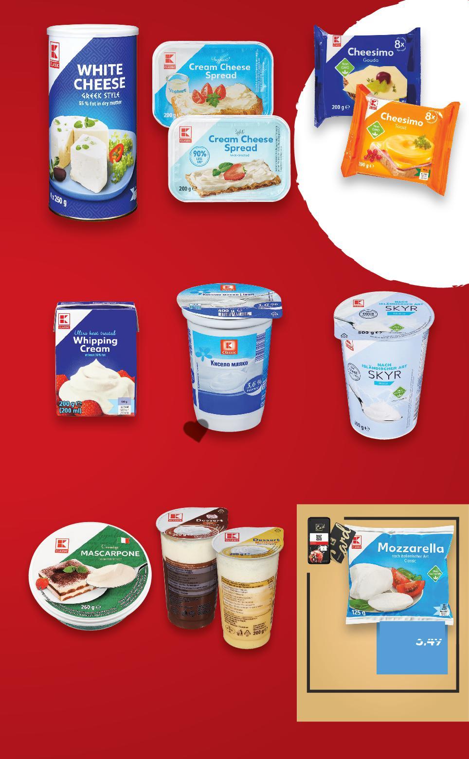 Отстъпката с Kaufland Card e изчислена спрямо стандартната текуща цена, на която продуктът се предлага в хипермаркета. *Със звездичка са обозначени артикулите, които са специално предложение до изчерпване на наличностите. Kaufland не носи отговорност за печатни грешки. -15% 16,99 19,99 -25% 2,59 3,49 3,99 само 0,79 само -35% 3,69 5,69 -12% 3,49 3,99 -28% 0,89 1,25 1,85 само -42% 1,99 с3,49 3,49 амо само 1 кг Сирене от краве мляко в саламура 1 кг (1 кг = 16,99) Крема сирене различни видове 200 г (1 кг = 12,95) Топено сирене за сандвичи различни видове 200 г (1 кг = 19,95) Пудинг със сметана шоколад или ванилия 200 г (1 кг = 3,95) Маскарпоне 80% масленост Произход: Италия 250 г (1 кг = 14,76) Скир натурален високопротеинов 500 г (1 кг = 6,98) Кисело мляко 3,6% масленост 400 г (1 кг = 2,23) Сметана за разбиване 30% масленост UHT 200 мл (1 л = 9,25) Моцарела 45% масленост 125 г (1 кг = 15,92) Цена с KAUFLAND CARD с ниско съдържание на мазнини S11-BG-KW04-LFT-KLC_R-1000-10 11