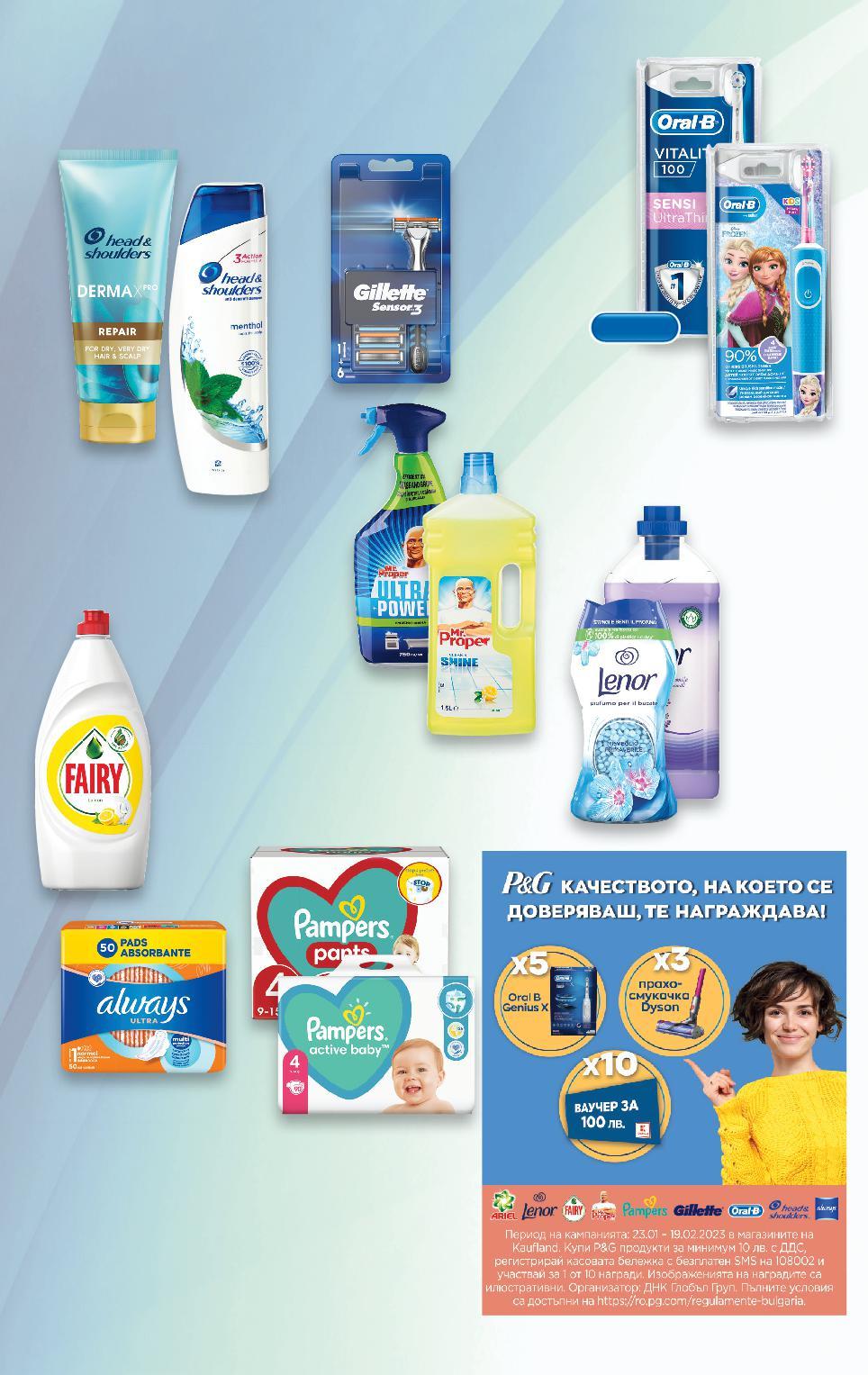 *Със звездичка са обозначени артикулите, които са специално предложение до изчерпване на наличностите. Kaufland не носи отговорност за печатни грешки. 9,99* само -27% 9,59 6,99 34,99* само 6,29 само -20% 6,29 7,95 -27% 4,39 6,09 11,99 37,99 само само ALWAYS Дамски превръзки Ultra Night или Ultra Normal 36 бр. или 50 бр. в опаковка (1 бр. = от 0,20) HEAD & SHOULDERS Шампоан, Балсам или Душ гел различни видове 145 - 360 мл (1 л = от 19,42) PAMPERS Бебешки пелени или гащички пелени: размери 3, 4, 5 или 6 68 - 104 бр. в опаковка гащички: размери 4, 5 или 6 60 - 72 бр. в опаковка (1 бр. = от 0,34) LENOR Омекотител или Парфюмни перли различни видове 1,7 л = 57 пранета или 140 г (1 л = 3,70) MR. PROPER Универсален препарат избрани видове спрей: 0,7500,800 мл или почистващ препарат: 1,0 - 1,5 л (1 л = до 8,39) FAIRY Препарат за съдове различни видове 450 - 800 мл (1 л = от 5,49) Електрическа четка за зъби Vitality D100 Sensi UltraThin или детска Frozen или Cars 2D въртеливо движение, вграден таймер GILLETTE Сaмобръсначка Sensor + 6 ножчета различни видове (1 бр. = 11,99) УСЕЩАНЕ ЗА СВЕЖЕСТ И ЧИСТОТА S35-BG-KW04-LFT-PEG_R-1000-10 35