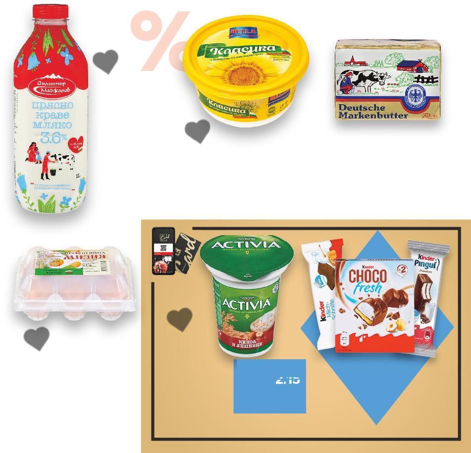 Отстъпката с Kaufland Card e изчислена спрямо стандартната текуща цена, на която продуктът се предлага в хипермаркета. *Със звездичка са обозначени артикулите, които са специално предложение до изчерпване на наличностите. Kaufland не носи отговорност за печатни грешки. -20% ОТСТЪПКА С KAUFLAND CARD ЗА ОХЛАДЕНИ ДЕСЕРТИ С МАРКА KINDER -31% 5,49 7,99 -18% 2,69 3,29 -34% 2,99 4,59 -25% 2,99 3,99 -32% 2,99 4,45 -24% 1,39 1,85 -22% 2,79 3,59 -21% 1,69 с2,15 амо 2,15 МЛЕЧНИ, РАСТИТЕЛНИ ПРОДУКТИ И ЯЙЦА DEUTSCHE MARKENBUTTER Краве масло 82% масленост 250 г (1 кг = 21,96) МИЗИЯ Кокоши яйца от подово отглеждани кокошки размер М 6 бр. (1 бр. = 0,45) BELLA Продукт за мазане Класика 450 г (1 кг = 6,65) ДИМИТЪР МАДЖАРОВ Прясно мляко 3,6% масленост 1 л (1 л = 2,99) МЕРОНЕ Извара обезмаслена 400 г (1 кг = 7,48) MY DAY Заквасена сметана 20% масленост 370 г (1 кг = 7,55) БЕЛЕНСКО Кисело мляко 4,5% масленост 400 г (1 кг = 3,48) DANONE Активиа пълнозърнеста различни видове 280 г (1 кг = 6,04) Цена с KAUFLAND CARD S25-BG-KW04-LFT-NMP1_R-1000-10 25
