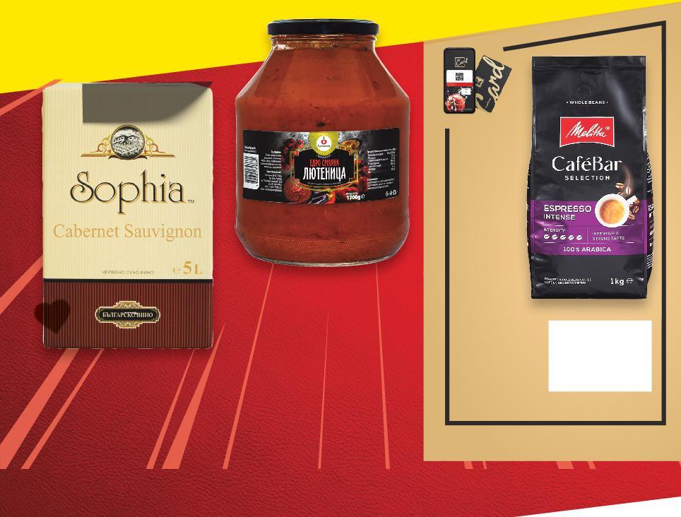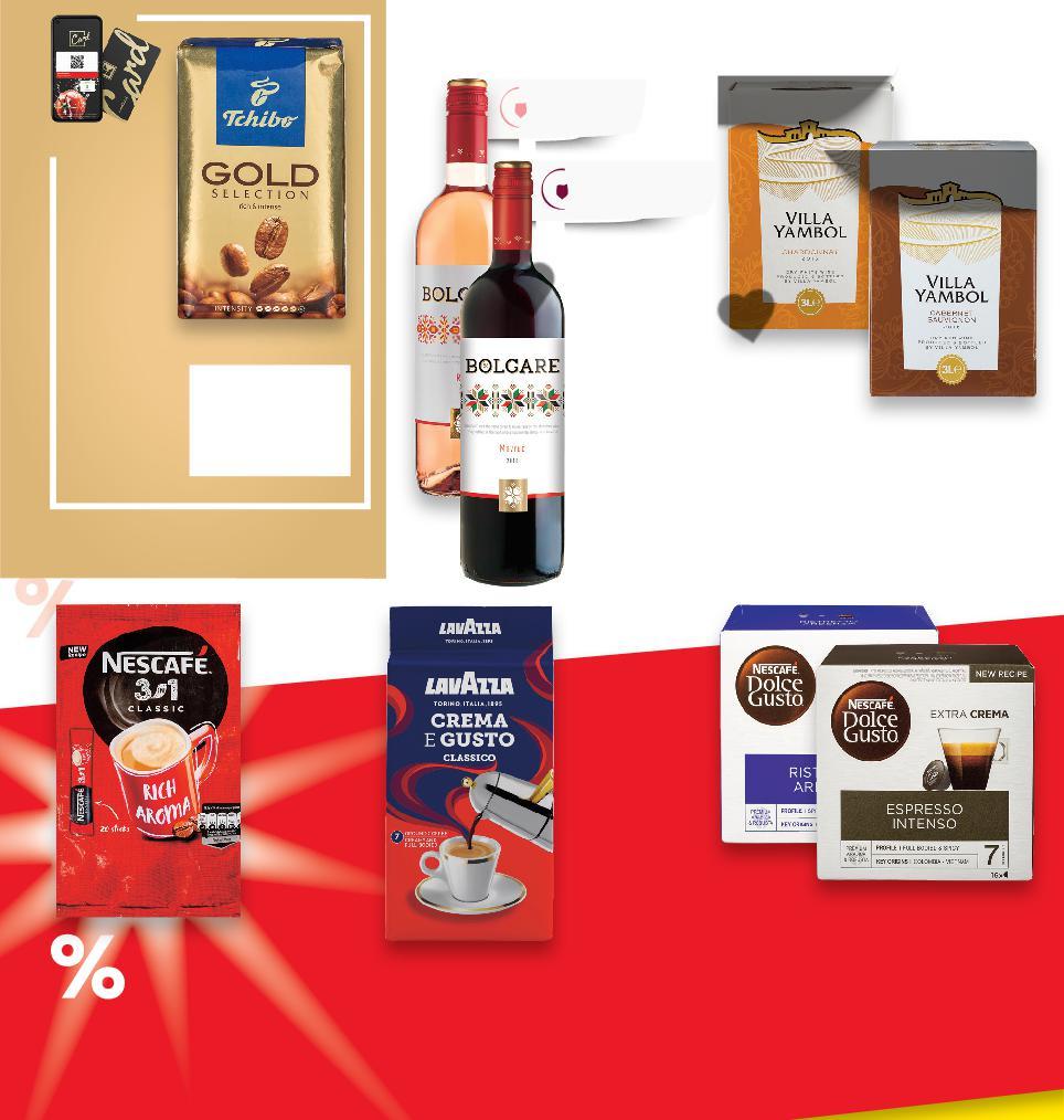 *Със звездичка са обозначени артикулите, които са специално предложение до изчерпване на наличностите. Kaufland не носи отговорност за печатни грешки. Аромат на череша Фин плодов аромат с лека пикантност КАФЕ -25% ОТСТЪПКА ЗА МАРКА ЯМБОЛСКА ГРОЗДОВА Аромат на екзотични плодове Аромат на горски плодове -28% 19,99 27,99 -19% 8,49 10,49 -25% 5,69 7,59 -39% 4,99 8,19 -27% 4,69 6,49 -25% 23,99 31,99 -25% 11,69 15,59 16 броя 1 литър 1 литър -29% 11,49 16,19 3 литра -15% 16,99 19,99 -50% 3,49 с6,99 6,99 амо само PLOMARI Узо 40% vol 1 л (1 л = 19,99) LAVAZZA CREMA E GUSTO Мляно кафе Произход: Италия 250 г (1 кг = 22,76) NESCAFE Разтворимо кафе 3 В 1 20 бр. в опаковка 330 г (1 бр. = 0,25) BOLGARE Червено, бяло вино или розе различни сортове Произход: България, Тракийска низина 0,75 л (1 л = 6,26) NESCAFE Кафе капсули Dolce Gusto различни видове 16 бр. в опаковка 88 - 256 г (1 бр. = 0,54) FLIRT Водка 37,5% vol 1 л (1 л = 11,69) JAMESON Ирландско уиски 40% vol 0,7 л (1 л = 34,28) VILLA YAMBOL Червено, бяло вино или розе различни сортове Произход: България, Тракийска низина 3 л BIB (1 л = 3,83) TCHIBO Мляно кафе Gold selection 250 г (1 кг = 13,96) Цена с KAUFLAND CARD FINLANDIA Водка 40% vol 0,7 л (1 л = 24,28) ВИНО И ВИСОКОАЛКОХОЛНИ НАПИТКИ Отстъпката с Kaufland Card e изчислена спрямо стандартната текуща цена, на която продуктът се предлага в хипермаркета. S31-BG-KW04-LFT-GEP_R-1000-10 31