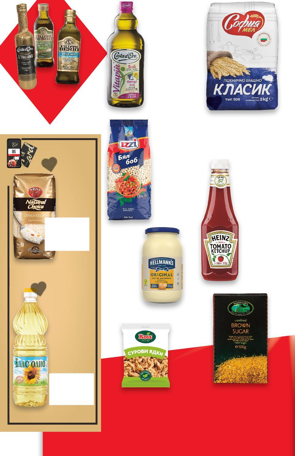 Цените са валидни за посочените на последна страница хипермаркети. Стоките се продават в количества, обичайни за едно домакинство. Всички цени са в лева с включен ДДС. Всички артикули се предлагат без декорация. Снимките са примерни. -40% ОТСТЪПКА ЗА ВСИЧКИ МАСЛИНОВИ МАСЛА 500 МЛ С МАРКА COSTA D'ORO И FILIPPO BERIO -33% 4,49 6,79 -10% 2,69 2,99 6,49* само -32% 3,99 5,95 -21% 4,49 5,69 -42% 9,25 15,99 -32% 3,65 5,39само само -42% 2,99 5,19 само с5,19 амо -31% 1,99 2,89 2 кг 1 литър ОСНОВНИ ХРАНИ IZZI Бял боб екстра качество 1 кг (1 кг = 4,49) СОФИЯ МЕЛ Брашно класик тип 500 2 кг (1 кг = 1,35) HELLMANS Майонеза Original 625 мл (1 л = 10,39) ROIS Сурови орехи половинки 150 г (1 кг = 26,60) HEINZ Кетчуп класик или лют 570 г (1 кг = 7,88) COSTA D’ORO Олио VITAPIU‘ зеленчуково 1 л (1 л = 9,25) КЛАС Олио слънчогледово 1 л (1 л = 3,65) KRINA Ориз екстра 1 кг (1 кг = 2,99) Цена с KAUFLAND CARD Цена с KAUFLAND CARD PASSIFLORA Кафява захар тръстикова 500 г (1 кг = 3,98) ДО 12 БРОЯ НА ПОКУПКА** **При покупка над 12 бр. всеки следващ продукт се продава на стандартна цена. Отстъпката с Kaufland Card e изчислена спрямо стандартната текуща цена, на която продуктът се предлага в хипермаркета. S28-BG-KW04-LFT-NMP2_L-1000-10 28
