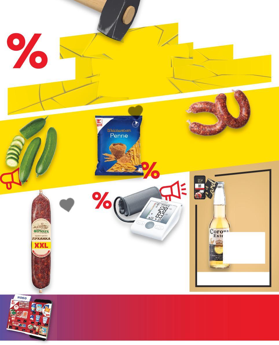 Отстъпката с Kaufland Card e изчислена спрямо стандартната текуща цена, на която продуктът се предлага в хипермаркета. Б А KAUFLAND И ДНИ С Ъ ТА СА KAUFLAND НИСКИ ЦЕНИ e изчи -50% 4,49 8,99 ФЕРМАТА Луканка вакуум опаковка 350 г (1 кг = 12,83) -50% 39,99 79,99 -49% 0,75 1,49 -16% 9,99 11,99 -29% 2,45 3,49 -45% 1,89 3,49само В Kaufland може да платиш с: Имаш предложения, желания или въпроси към Kaufland – свържи се с нас! 0800 / 12 220 (Национален безплатен клиентски телефон) с ново работно време: понеделник – петък 08:00 – 18:30.Стоките се продават в количества, предназначени за домакинството. *Със звездичка са обозначени артикулите, които са специално предложение до изчерпване на наличностите. **Сертификат BestBuy за най-добро съотношение цена - качество по данни от изследване на независимата швейцарска организация ICERTIAS. Kaufland не носи отговорност за печатни грешки. Всички предложения може да видиш и на kaufland.bg, facebook.com/kaufland.bulgaria Апарат за кръвно налягане маншет 22 - 36 см, измерва систолично, диастолично налягане и пулс, включена чанта за съхранение и батерии Фусили или Пене от мека пшеница 500 г (1 кг = 1,50) Пресен суджук за сушене и печене кг (1 кг = 9,99) Късоплодни краставици Клас: I кг CORONA EXTRA Бира 4,5% vol 0,355 л (1 л = 5,33) Цена с KAUFLAND CARD САМО НА 27.01. И 28.01.2023 ИНФОРМИРАЙ СЕ ЗА KAUFLAND ИЗГОДНИТЕ ЦЕНИ И ВЪВ VIBER АБОНИРАЙ СЕ ЗА НАШАТА СЕДМИЧНА БРОШУРА СОФИЯ,жк Банишора, ул. Скопие 1 , жк Бъкстон, ул. Тодор Каблешков 3 , жк Дружба 2 , ул. Хайделберг 1 , жк Крива Река, бул. Ген. Тотлебен 36 , жк Люлин 7, бул. Петър Дертлиев 56 ,жк Малинова долина, ул. Проф. д-р Иван Странски 20 , жк Младост 3, ул. Филип Аврамов 3 , жк. Младост 4, ул. Околовръстен път 271 , жк Слатина, ул. Асен Йорданов 7 , жк Хаджи Димитър, ул. Резбарска 7Б , кв. Горубляне, ул. „Владичина ливада“ 2 , КЮСТЕНДИЛ, бул. Македония 10 Риба от витрина с обслужване Риба от витрина на самообслужване Грил щанд S52-BG-KW04-LFT-RS-1000-10