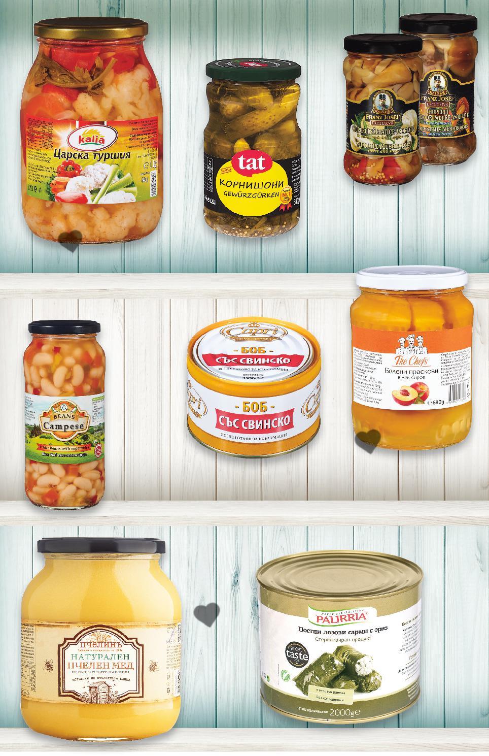 *Със звездичка са обозначени артикулите, които са специално предложение до изчерпване на наличностите. Kaufland не носи отговорност за печатни грешки. -26% 3,29 4,49 -32% 2,69 3,99 -14% 11,99 13,99 -34% 3,29 4,99 -35% 2,69 4,19 -33% 2,99 4,49 900 грама -31% 15,99 23,39 2 кг -25% 2,99 3,99 KALIA Царска туршия 950 г (1 кг = 3,47) CAPRI Боб с кюфтета или наденица 400 г (1 кг = 6,73) ПЧЕЛИНЪ Пчелен мед 900 г (1 кг = 13,33) THE CHEFS Белени праскови 680 г (1 кг = 4,84) CAMPESE Бял боб със зеленчуци 540 г (1 кг = 4,99) TAT Корнишони 680 г (1 кг = 4,40) PALIRRIA Лозови сарми 60 бр. 2 кг (1 кг = 8,00) KAIZER FRANZ Гъби различни видове 280 г (1 кг = 10,68) натурален S27-BG-KW04-LFT-KONS_R-1000-10 27