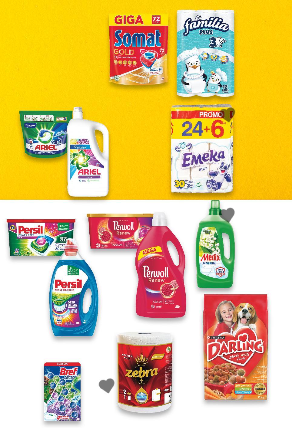 Цените са валидни за посочените на последна страница хипермаркети. Стоките се продават в количества, обичайни за едно домакинство. Всички цени са в лева с включен ДДС. Всички артикули се предлагат без декорация. Снимките са примерни. 30/33/40 пранета 1 изпиране = 0,67/0,61/0,50лв. 38 пранета 1 изпиране = 0,45 лв. 65 пранета 1 изпиране = 0,52 лв. 60 пранета 1 изпиране = 0,34 лв. 90 пранета 1 изпиране = 0,38 лв. 62 пранета 1 изпиране = 0,28 лв. 10 кг -45% 22,99 41,99 19,99* само 11,99* само -28% 4,99 6,99 -41% 6,99 11,99 23,99* само -27% 33,49 45,99 16,99* само -30% 2,35 3,39 19,99 само ПРОМОПАКЕТ DARLING Суха храна за кучета с месо и зеленчуци или с пиле 10 кг (1 кг = 2,30) ЕМЕКА Тоалетна хартия Paradise или White трипластова целулозна 24 + 6 бр. (1 бр. = 0,67) FAMILIA Кухненска ролка трипластова бяла 12 бр. в опаковка (1 бр. = 1,00) ZEBRA Кухненска ролка Рrofessional двупластова 250 къса 1 бр. BREF WC блокче Power Activ различни видове дълготрайна свежест антиваровик ефект 4 бр. x 50 г SOMAT Таблетки или Гел за съдомиялна таблетки: Gold, All in1 или Excellence 65 - 90 бр. = 65 - 90 измивания гел: Excellence 2 х 900 мл = 2 х 50 измивания (1 бр. = от 0,27) ARIEL Гел или Капсули за пране гел: различни видове 4,95 л = 90 пранета капсули: Mountain Spring 65 бр. = 65 пранета (1 л = 6,77) PERWOLL Гел или Капсули за пране 3,72 л = 62 пранета или 38 бр. = 38 пранета (1 л = 4,57) MEDIX Универсален почистващ препарат различни видове 1 л (1 л = 2,35) PERSIL Прах, Гел или Капсули за пране прах: Color 3,38 кг = 52 пранета гел: различни видове 3 л = 60 пранета капсули: Color или Universal 30/ 33 / 40 бр. = 30/ 33 / 40 пранета (1 л = 6,67) 12 броя, ДРОГЕРИЯ S34-BG-KW04-LFT-PEG_L-1000-10 34