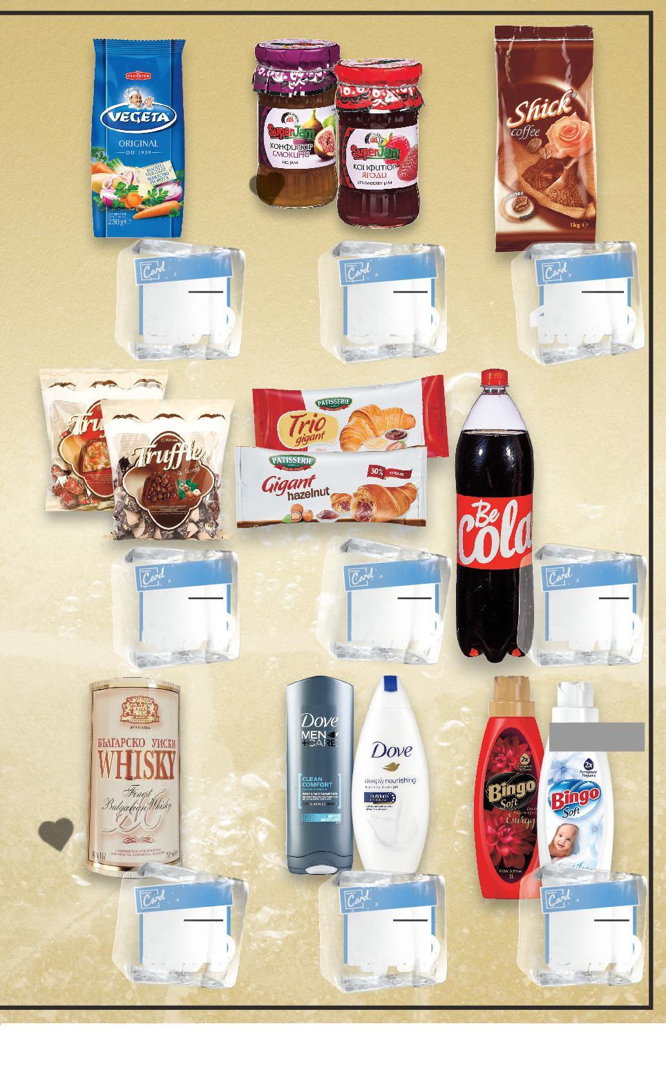 *Със звездичка са обозначени артикулите, които са специално предложение до изчерпване на наличностите. Kaufland не носи отговорност за печатни грешки.- ---20 пранета 1 изпиране = 0,20 лв. *Със звездичка са обозначени артикулите, които са специално предложение до изчерпване на наличностите с с с с са Kaufland не носи отговорност за печатни грешки с с с SHICK Кафе на зърна 1 кг (1 кг = 11,99) ДЖЕМ И ДЖЕМ Конфитюр различни видове 360 г (1 кг = 9,14) VEGETA Универсална подправка 250 г (1 кг = 11,16) BE Газирана напитка кола, портокал или битер лимон 1,5 л (1 л = 0,80) TRUFFLE Бонбони ягоди или лешник 500 г (1 кг = 9,98) DOVE Душ гел различни видове 225 - 250 мл (1 л = от 17,96) А-AC Уиски 40% vol 0,7 л (1 л = 12,85) BINGO SOFT Омекотител различни видове 1 л = 20 пранета (1 л = 3,99) PATISSERIE GIGANT Кроасан различни вкусове 180 г (1 кг = 11,06) Цена с KAUFLAND CARD Цена с KAUFLAND CARD Цена с KAUFLAND CARD Цена с KAUFLAND CARD Цена с KAUFLAND CARD Цена с KAUFLAND CARD Цена с KAUFLAND CARD Цена с KAUFLAND CARD Цена с KAUFLAND CARD S9-BG-KW04-LFT-PREIS_R-1000-10 9