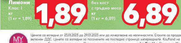 -29% 1,89 2,69 само 6,89 -54% 5,00 10,99 -36% 0,50 0,79 -54% 1,00 2,19 -43% 0,50 0,89 -37% 2,00 3,19 -33% 2,00 2,99 -40% 1,00 1,69 -32% 23,79 34,99 3само 4,99 само 0,50 ,50 0,50 ,50 5,00 5,00 1,00 ,00 1,00 1,00 2,00 2,00 2,00 2,00 Лимони Клас: I кг (1 кг = 1,89) Свинска плешка без кост с гръдно месо кг (1 кг = 6,89) CHEF CARLO Грах 400 г (1 кг = 2,50) ВВВ Нектар различни видове 0,2 л (1 л = 2,50) EDUSCHO Мляно кафе 500 г (1 кг = 10,00) NESTLE Вафла Мура различни видове 30 - 45 г (1 кг = от 11,12) CIRIO Сос за спагети Basilico, Napoletana или Arrabbiata 420 г (1 кг = 4,77) LA MOLISANA Макаронени изделия избрани видове 250 г (1 кг = 8,00) MEGGLE Йогурт за пиене пъпеш, ягода или горски плод 300 мл (1 л = 3,34) JOHNNIE WALKER Шотландско уиски 40% vol 1 л (1 л = 23,79) Цена с KAUFLAND CARD Цените са валидни от 23.01.2023 до 29.01.2023 или до изчерпване на наличностите. Стоките се продават в количества, обичайни за едно домакинство. Всички цени са в лева с включен ДДС. Цените са валидни за посочените на последна страница хипермаркети. Kaufland не носи отговорност за печатни грешки. Всички артикули се предлагат без декорация. Снимките са примерни. Предложенията може да видиш и на kaufland.bg. Повече за Моите любими марки научи на kaufland.bg/otlichiya. *Със звездичка са обозначени артикулите, които са специално предложение до изчерпване на наличностите. **Всяка седмица намаляваме най-малко 10 продукта с 50%. Отстъпката с Kaufland Card e изчислена спрямо стандартната текуща цена, на която продуктът се предлага в хипермаркета. ОТ ПОНЕДЕЛНИК, 23.01.2023 ДО НЕДЕЛЯ, 29.01.2023 НАД 400 ПРОМОЦИИ ВСЯКА СЕДМИЦА НАМАЛЕНИЯ ДО -50%** ИЗГОДНИ ПРЕДЛОЖЕНИЯ С KAUFLAND CARD ! С KAUFLAND СПЕСТЯВАЙ !! S1-BG-KW04-LFT-TS-1000-10