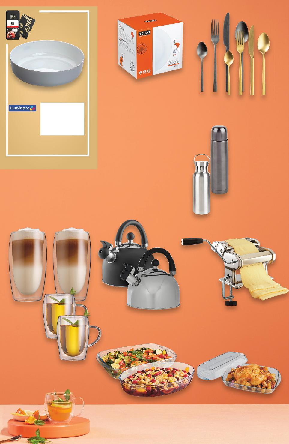 Цените са валидни за посочените на последна страница хипермаркети. Стоките се продават в количества, обичайни за едно домакинство. Всички цени са в лева с включен ДДС. Всички артикули се предлагат без декорация. Снимките са примерни. ПРИГОТВИ. СЪХРАНИ. СПЕСТИ -50% 14,49 28,99 -50% 6,99 13,99 12,99 25,99* само само -44% 39,99 71,99 39,99* само 14,99* 12,99 -50% 8,99 17,99 само 16 части 19 части 14,99 11,99* SPICE&SOUL Тава с капак термоустойчиво стъкло /от -40°C до 300°C/ 36 x 22 x 11 см, 5 л, SPICE&SOUL Тава боросиликатно стъкло, от -40° C до 300° C, правоъгълна 36 х 5,5 х 22 см или овална 35 x 6 x 24 см, 1 бр. ZELIE Сервиз за хранене опал, бял или черен, 6 основни чинии Ø25 см, 6 дълбоки чинии Ø20 см, 6 десертни чинии Ø18 см и купа за салата Ø24 см SPICE&SOUL Чайник благородна стомана, 2 л SPICE&SOUL Машина за прясна паста хромирана карбонова стомана и алуминий, настройки за 9 дебелини на тестото, 3 приставки, вкл. за лазаня, 21 x 14 x 20 см SPICE&SOUL Комплект прибори за хранене само SPICE&SOUL Термочаши двойно боросиликатно стъкло 19,99 -35% Кръгла тава Diwali за печене и сервиране Ø26 см Цена с KAUFLAND CARD за чай 2 x 250 мл или за капучино 2 х 350 мл 2 х 450 мл SPICE&SOUL Термос благородна стомана, с двойна стена 21,99 -31% само 525 мл 1 л с двойна стена Отстъпката с Kaufland Card e изчислена спрямо стандартната текуща цена, на която продуктът се предлага в хипермаркета. S38-BG-KW04-LFT-NFP2_L-1000-10 38