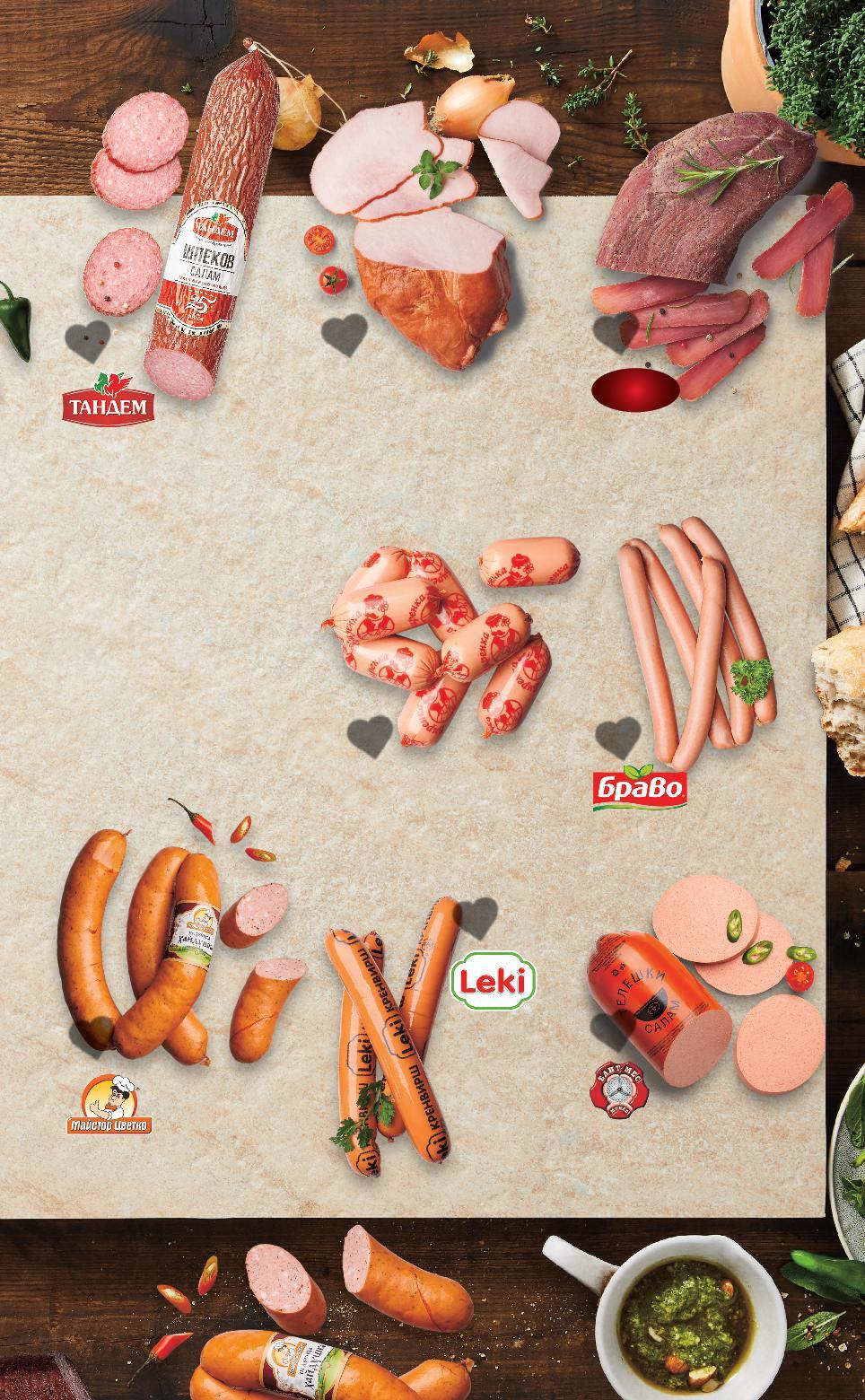 *Със звездичка са обозначени артикулите, които са специално предложение до изчерпване на наличностите. Kaufland не носи отговорност за печатни грешки. 24,89* само -22% 8,49 10,89 -41% 4,99 8,59 -27% 6,49 8,99 -30% 8,39 11,99 -36% 18,99 29,99 -32% 7,99 11,89 -28% 9,89 13,89 Бут по еленски сурово-сушен кг (1 кг = 24,89) Кренвирши свински кг (1 кг = 8,49) Салам Хамбургски или Телешки кг (1 кг = 4,99) Биренка кг (1 кг = 6,49) Наденица Хайдушка кг (1 кг = 8,39) Салам шпеков от свинско месо кг (1 кг = 18,99) Дебърцини кг (1 кг = 7,99) Свински бут варено-пушен кг (1 кг = 9,89) НАД 100 КОЛБАСА ЩЕ НАМЕРИШ ПРИ НАС по традиционна рецепта от Еленския балкан подправен с чесън S17-BG-KW04-LFT-BED2_R-1000-10 17
