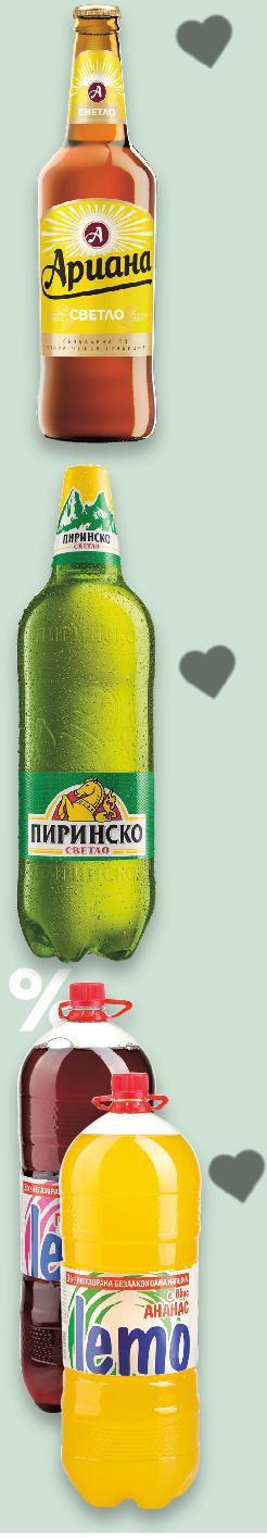 Цените са валидни за посочените на последна страница хипермаркети. Стоките се продават в количества, обичайни за едно домакинство. Всички цени са в лева с включен ДДС. Всички артикули се предлагат без декорация. Снимките са примерни. -40% 1,19 1,99 -28% 1,39 0,99 -24% 1,09 1,45 -39% 2,29 3,79 -27% 1,29 1,79 -20% 3,59 4,49 -38% 1,59 2,59 -21% 2,19 2,79 -40% 2,69 4,49само само 2 литра 2 литра 3 литра 10 литра TUBORG Бира 4,6% vol 0,5 л кен (1 л = 2,38) АРИАНА Бира 4,5% vol * Цената не включва амбалаж * Цена на амбалаж 0,10 лв. 0,5 л бутилка (1 л = 1,98) ЗАГОРКА Бира Специално или Ретро 4,9% или 4,5% vol 0,5 л кен (1 л = 2,18) ХИСАР Минерална вода 10 л РЕТ (1 л = 0,23) LEMO Негазирана напитка различни видове 3 л (1 л = 0,43) QUEEN ALOE VERA Безалкохолна напитка различни видове 1,5 л (1 л = 2,40) PEPSI/ MIRINDA/ 7 UP Газирана напитка различни видове 2 л РЕТ (1 л = 0,80) ПИРИНСКО Бира 4,4% vol 2 л PET (1 л = 1,10) GRANINI Сок портокал с пулп, ябълка или домат 1 л (1 л = 2,69) Цена с KAUFLAND CARD БЕЗАЛКОХОЛНИ НАПИТКИ И БИРА Отстъпката с Kaufland Card e изчислена спрямо стандартната текуща цена, на която продуктът се предлага в хипермаркета. S32-BG-KW04-LFT-DRP_L-1000-10 32