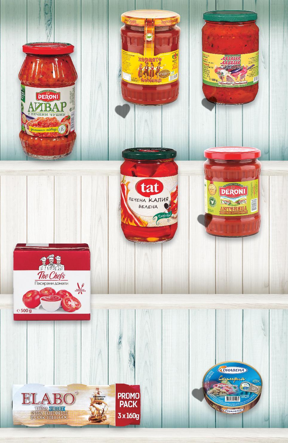 Цените са валидни за посочените на последна страница хипермаркети. Стоките се продават в количества, обичайни за едно домакинство. Всички цени са в лева с включен ДДС. Всички артикули се предлагат без декорация. Снимките са примерни. 7,99* само -28% 4,79 6,69 -47% 1,69 3,19 -50% 1,69 3,39 -34% 4,29 6,59 -33% 5,99 8,99 -32% 4,49 6,69 -39% 3,79 6,29 ELABO Риба тон филе в собствен сос или в растително масло 3 x 160 г (1 кг = 16,65) DERONI Лютеница традиционна, домашна или пикантна 575 г (1 кг = 8,34) ДИАВЕНА Скумрия различни видове 160 г (1 кг = 10,57) THE CHEFS Домати пасирани 500 г (1 кг = 3,38) TAT Печена капия белена, овкусена 670 г (1 кг = 6,41) MERLINI DANIMOND Миш-маш 680 г (1 кг = 6,61) DERONI Домашен айвар с печени чушки 500 г (1 кг = 11,98) ХОРЦЕТО Лютеница 560 г (1 кг = 6,77) КОНСЕРВИ СПЕСТИ 3 лв. ! СПЕСТИ ДО -50% -50% -50% -50% S26-BG-KW04-LFT-KONS_L-1000-10 26