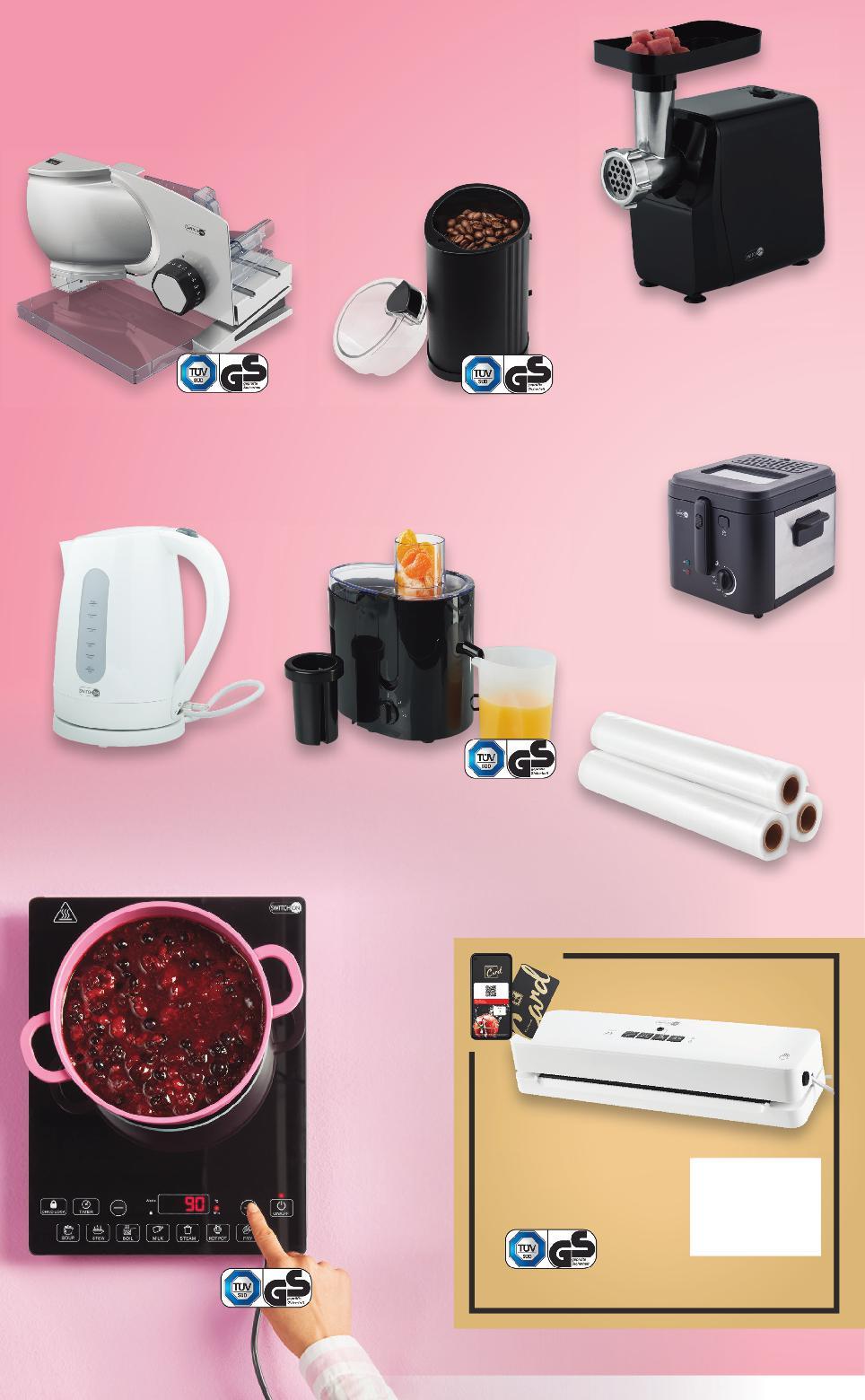 Отстъпката с Kaufland Card e изчислена спрямо стандартната текуща цена, на която продуктът се предлага в хипермаркета. Цените са валидни за посочените на последна страница хипермаркети. Стоките се продават в количества, обичайни за едно домакинство. Всички цени са в лева с включен ДДС. Всички артикули се предлагат без декорация. Снимките са примерни. СПЕСТИ 20 лв. ! 69,99 само 69,99 само -23% 99,99 129,90 59,99 64,99 само само -40% 29,99 49,99 19,99 само -10% 24,99 27,99 -31% 54,99 79,99 7само 9,99 само 3 броя SWITCH ON Машина за рязане до 20 мм ширина на рязане, 120 W SWITCH ON Фритюрник DF-G0X01 настройка на температурата до 190° C, свалящ се алуминиев капак с перманентен филтър, кошница от благородна стомана, 2,5 л SWITCH ON Месомелачка MG-B0201 нож от неръждаема стомана, функция обратно завъртане, различни приставки, 600 W SWITCH ON Електрическа кана за вода защита от прегряване, 1,7 л, 2550 - 3000 W Сокоизстисквачка NN-JU-01 за плодови и зеленчукови сокове, 2 степени на скорост, 500 мл, 400 W SWITCH ON Индукционен котлон IC-D0201 7 програми, автоматично разпознаване размера на съда (16 - 26 см), таймер, тъчсензор, 2000 W SWITCH ON Фолио за вакуумиране подходящо от -20° до 110° C, 28 х 300 см SWITCH ON Кафемелачка A0201 нож и купа от благородна стомана, включена четка за почистване, 150 W SWITCH ON Уред за вакуумиране функция запечатване включено 3 м фолио Цена с KAUFLAND CARD ВЕРНИ ПОМOЩНИЦИ В КУХНЯТА S40-BG-KW04-LFT-NFP3_L-1000-10 40