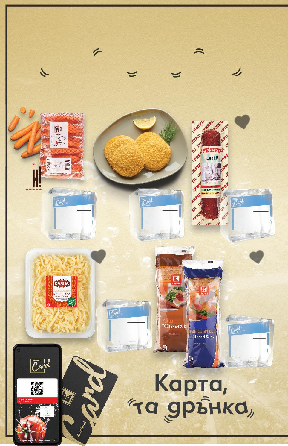 Цените са валидни за посочените на последна страница хипермаркети. Стоките се продават в количества, обичайни за едно домакинство. Всички цени са в лева с включен ДДС. Всички артикули се предлагат без декорация. Снимките са примерни. ПАДАТ И ЦЕНИТЕ П и температурите падат, НАД 200 ПО НИСКИ ЦЕНИ през цел K fland Card- -са с с 1 с Тостерен хляб пълнозърнест или ръжен 550 г (1 кг = 1,62) САЯНА Кашкавал от краве мляко настърган 400 г (1 кг = 20,73) Моркови Клас: I 1кг в опаковка (1 кг = 1,29) AMADORI Кордон Бльо с пуешка шунка 250 г (1 кг = 17,96) РЕТРО Шпек трайно варено-пушен вакуум опаковка 210 г (1 кг = 24,72) Цена с KAUFLAND CARD Цена с KAUFLAND CARD Цена с KAUFLAND CARD Цена с KAUFLAND CARD Цена с KAUFLAND CARD Намаляваме през януари 2023 г. цените с Kaufland Card на над 200 артикула. Отстъпката с Kaufland Card e изчислена спрямо стандартната текуща цена, на която продуктът се предлага в хипермаркета. S8-BG-KW04-LFT-PREIS_L-1000-10 8
