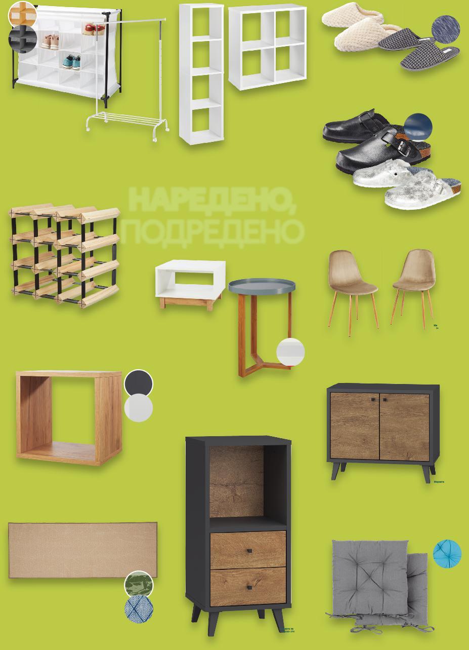 Цените са валидни за посочените на последна страница хипермаркети. Стоките се продават в количества, обичайни за едно домакинство. Всички цени са в лева с включен ДДС. Всички артикули се предлагат без декорация. Снимките са примерни. 19,99* само 59,99* само 99,99* само 26,99* само 39,99 149,90* само само 49,99* само 39,99* само 49,99* само 8,99* само 14,99* 19,99* 2 броя 2 броя 17,99* само SPICE&SOUL Възглавница за стол 40 х 40 х 4 см сертификат OEKO-TEX® Етажерка за стена меламиново покритие, 35 x 35 x 30 см Шкаф с 2 чекмеджета, метален обков, меламиново покритие, 76 x 35 x 35 см, Шкаф с 2 врати метален обков, меламиново покритие, устойчиво на надраскване, 49 x 57 x 30 см LIV&BO Помощна или квадратна масичка плот от MDF, стабилни крака от бамбук, различни цветове, 35 х 40 x 50 см или 35 х 50 х 50 см натоварване до 25 кг LIV&BO Регал за вино за 12 бутилки, метал и дърво, 32 x 24 x 32 см LIV&BO Трапезен стол тапицирана седалка, метални крака, натоварване до 110 кг, 44 x 53 x 87 см OYANDA/ TOWNLAND Пантофи дамски или мъжки, 36 - 47 LIV&BO Етажерка за обувки или Гардероб на колела Етажерка: 84 x 35 x 66 см Гардероб: 111 x 51 x 132 - 177 см Етажерка корпус от ПДЧ, 142 x 37 x 30 см или 72 x 72 x 30 см SPICE&SOUL Пътека противоплъзгаща основа, сертификат OEKO-TEX® само 57 x 150 см само 67 x 180 см OYANDA/ TOWNLAND Чехли с подплата дамски или мъжки, 37 - 46 НАРЕДЕНО, ПОДРЕДЕНО Нашите марки S40-BG-KW03-LFT-NFP5_L-1000-10 40