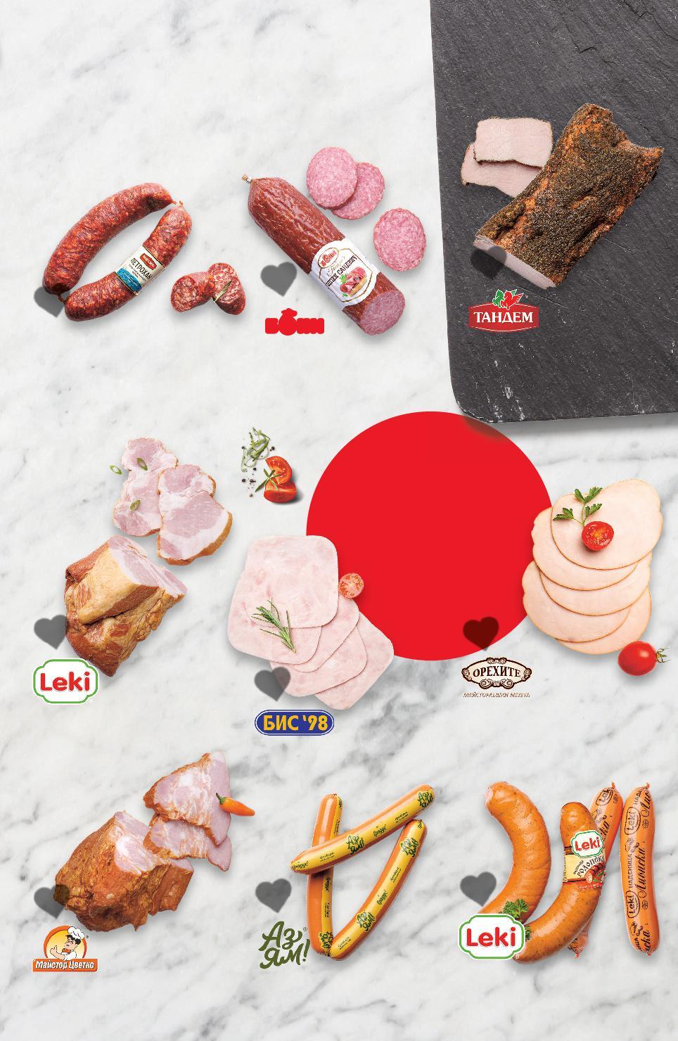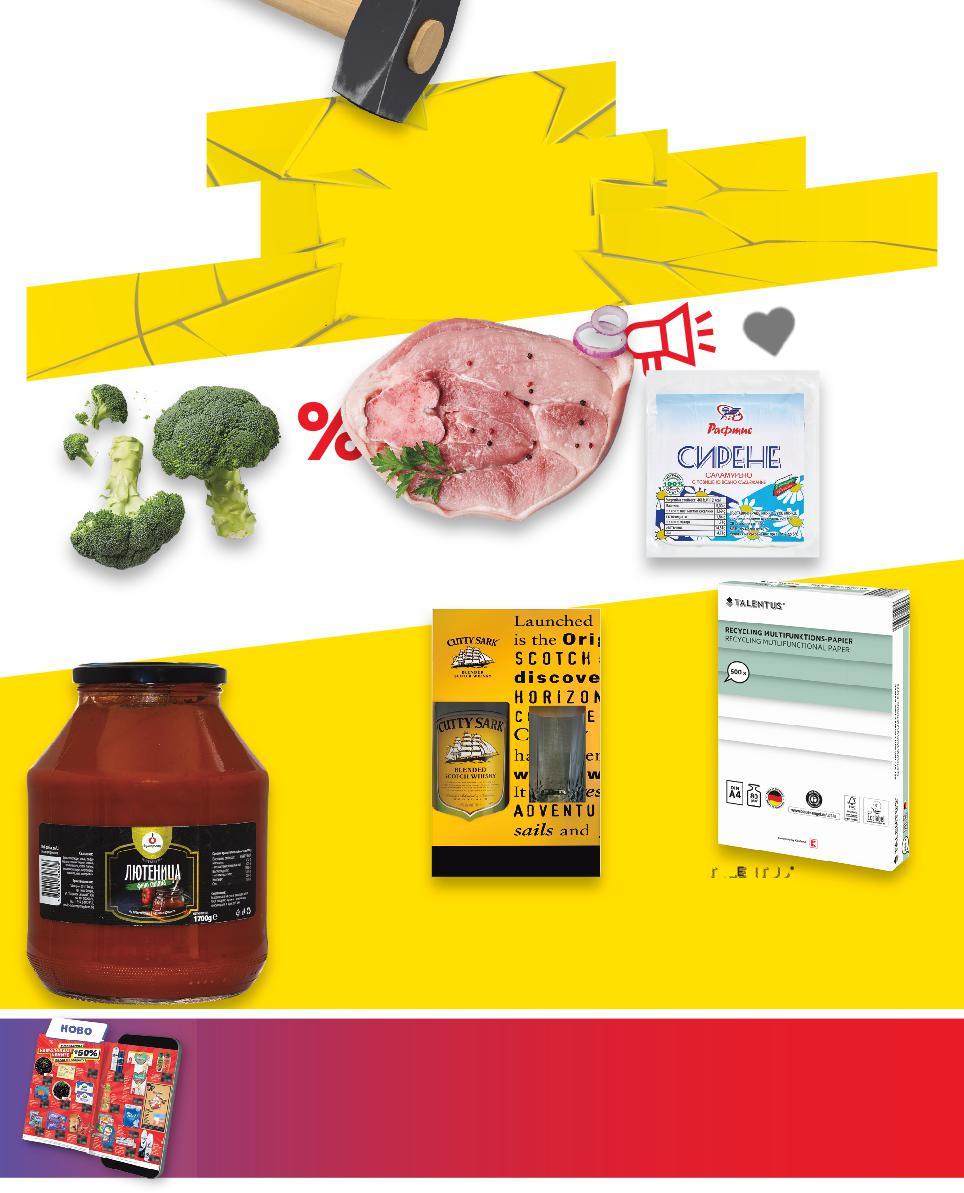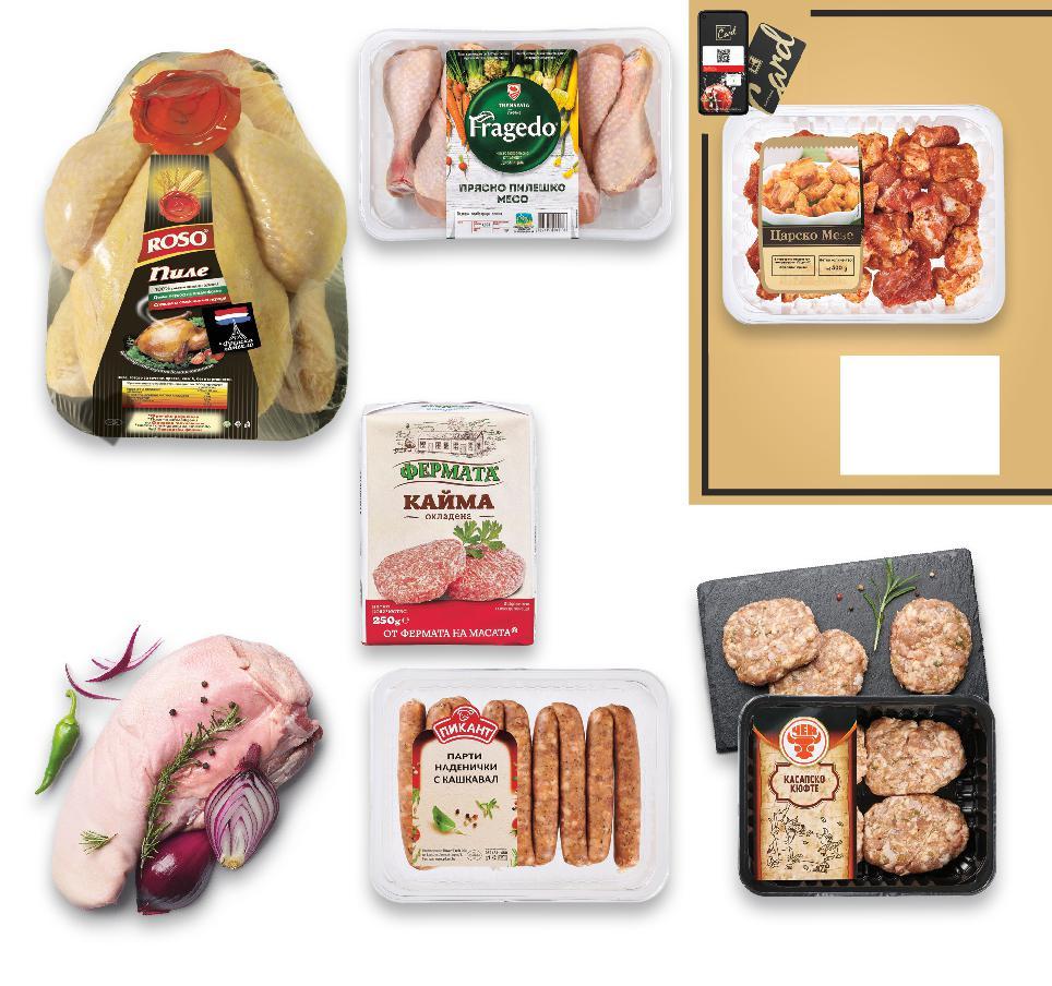 5500 Цените са валидни за посочените на последна страница хипермаркети. Стоките се продават в количества, обичайни за едно домакинство. Всички цени са в лева с включен ДДС. Всички артикули се предлагат без декорация. Снимките са примерни. 4,99* само -32% 26,89 39,99 -35% 25,99 39,99 -37% 2,95 4,69 -28% 5,75 7,99 2,79 само -27% 3,49 4,79 ПЕРЕЛИК Бански старец 180 г (1 кг = 27,73) Луканка Смядовска или Пиринка сурово-сушена 100 г се правят от 176 г свинско месо кг (1 кг = 26,89) Свинска пастърма Кайзер с класическа поръска от червен пипер кг (1 кг = 25,99) БОНИ Бирени пръчици 140 г (1 кг = 21,08) Горнооряховски суджук 200 г (1 кг = 28,75) Кокоши яйца размер L 6 бр. в опаковка (1 бр. = 0,47) Наденица 330 г (1 кг = 10,58) БЪЛГАРСКИ ПРОДУКТИ с ароматни подправки сурово-сушена 40 дни от 97% говеждо месо стандарт „Стара планина“ от свободно отглеждани кокошки S2-BG-KW03-LFT-BG1_L-1000-10 2