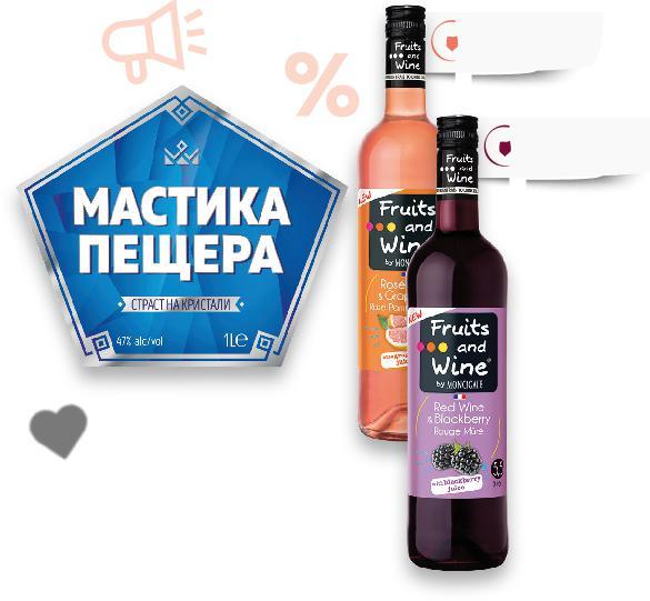 Цените са валидни за посочените на последна страница хипермаркети. Стоките се продават в количества, обичайни за едно домакинство. Всички цени са в лева с включен ДДС. Всички артикули се предлагат без декорация. Снимките са примерни. Свеж балансиран плодов аромат Аромат на вишни и череши Аромат на къпини 1 литър 1 литър 1 литър 1 литър С аромат на екзотични плодове и пъпеш Цените са валидни за посочените на последна страница хипермаркети Стоките се продават в количества, обичайни за едно домакинство -25% 28,99 38,99 -21% 37,99 48,59 -22% 6,99 8,99 -15% 26,99 31,99 -21% 14,99 18,99 -25% 5,99 7,99 -22% 12,79 16,49 -33% 23,99 35,99 -22% 22,99 29,49 12-годишно TULLAMORE DEW Ирландско уиски 40% vol 1 л (1 л = 28,99) JOHNNIE WALKER Шотландско уиски Black label 40% vol 0,7 л (1 л = 54,28) FRUITS AND WINE Ароматизирана напитка на винена основа различни видове Произход: Франция 0,75 л (1 л = 9,32) BICKENS Джин London Dry 40% vol 1 л (1 л = 26,99) SMIRNOFF NO.21 Водка 37,5% vol 0,7 л (1 л = 21,42) CHATEAU SVISHTOV Червено, бяло вино или розе различни сортове Произход: България, Дунавска равнина 0,75 л (1 л = 7,99) ПЕЩЕРА Мастика 47% vol 1 л (1 л = 12,79) BAILEYS Крем ликьор оригинал 17% vol 0,7 л (1 л = 32,85) JIM BEAM Бърбън уиски 40% vol 1 л (1 л = 23,99) ВИНО И ВИСОКОАЛКОХОЛНИ НАПИТКИ S28-BG-KW03-LFT-GEP_L-1000-10 28