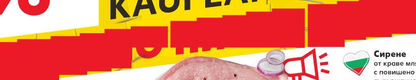 Цените са валидни за посочените на последна страница хипермаркети. Стоките се продават в количества, обичайни за едно домакинство. Всички цени са в лева с включен ДДС. Всички артикули се предлагат без декорация. Снимките са примерни. -27% 3,99 5,49 -26% 6,99 9,49 -25% 5,79 7,79 -32% 3,29 4,85 1,09* само 21,99 само 9,99 -20% 3,99 4,99 само -16% 4,99 с5,99 5,99 амо само -16% 4,99 5,99 ARLA Моцарела, Гауда или Хаварти слайс Произход: Дания 150 г (1 кг = 26,60) FRAGEDO Пилешка подбедрица кг (1 кг = 6,99) OLYMPUS Сирене Фета от овче и козе мляко Произход: Гърция 200 г (1 кг = 28,95) GRAN MORAVIA Твърдо сирене настъргано Произход: Италия 100 г (1 кг = 32,90) ФЕРМАТА Кайма универсална oхладена 250 г (1 кг = 4,36) Телешки език кг (1 кг = 21,99) Парти наденички с кашкавал 400г (1 кг = 9,98) ROSO Цяло пиле прясно без добавена вода кг (1 кг = 9,99) Царско мезе 500 г (1 кг = 9,98) Цена с KAUFLAND CARD Касапски кюфтета от свинско месо и пушен свински бекон 440 г (1 кг = 11,35) МЕСО ОТ ВИТРИНА НА САМООБСЛУЖВАНЕ СИРЕНЕ И КАШКАВАЛ ОТ ВИТРИНА НА САМООБСЛУЖВАНЕ S18-BG-KW03-LFT-SB_L-1000-10 18