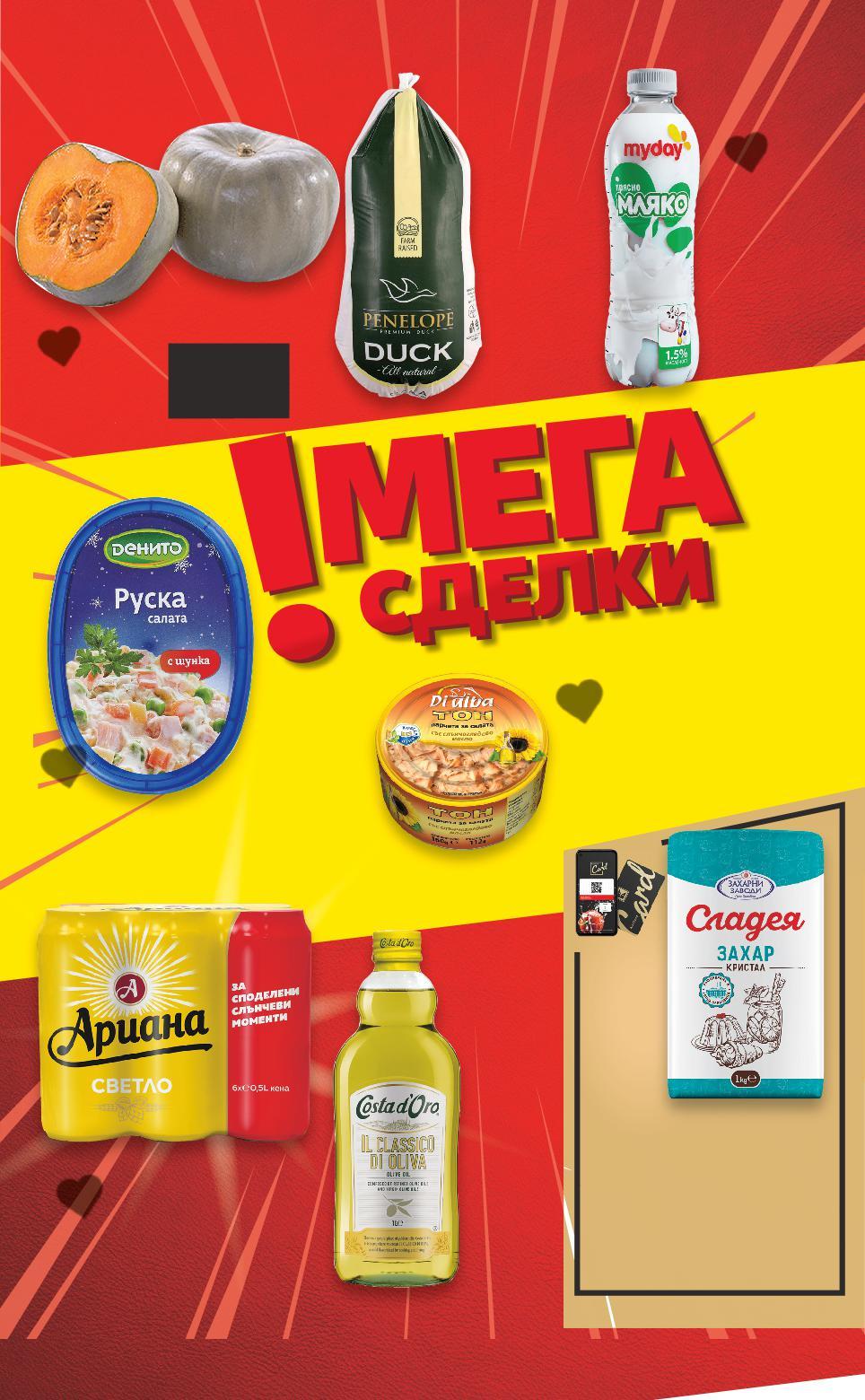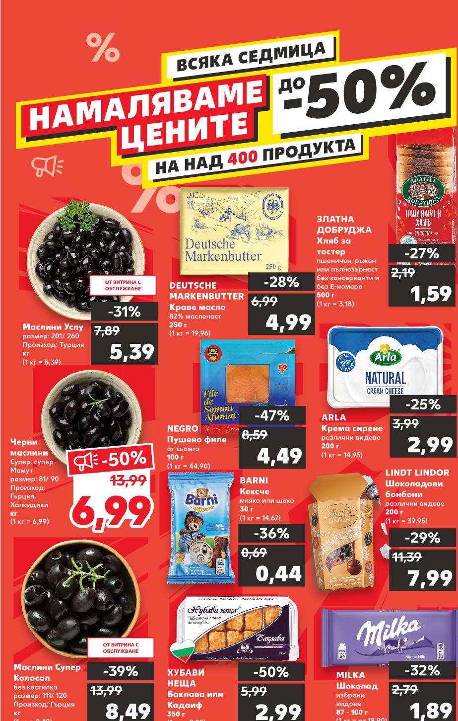 Цените са валидни за посочените на последна страница хипермаркети. Стоките се продават в количества, обичайни за едно домакинство. Всички цени са в лева с включен ДДС. Всички артикули се предлагат без декорация. Снимките са примерни. ВСЯКА СЕДМИЦА-50%ДО НАМАЛЯВАМЕ ЦЕНИТЕ НА НАД 400 ПРОДУКТА -29% 7,99 11,39 -32% 1,89 2,79 -50% 2,99 5,99 -39% 8,49 13,99 -31% 5,39 7,89 -47% 4,49 8,59 -25% 2,99 3,99 -28% 4,99 6,99 -36% 0,44 0,69 -27% 1,59 2,19 -50% 6,99 13,99 LINDT LINDOR Шоколадови бонбони различни видове 200 г (1 кг = 39,95) MILKA Шоколад избрани видове 87 - 100 г (1 кг = oт 18,90) ХУБАВИ НЕЩА Баклава или Кадаиф 350 г (1 кг = 8,55) Маслини Супер Колосал без костилка размер: 111/ 120 Произход: Гърция кг (1 кг = 8,49) Маслини Услу размер: 201/ 260 Произход: Турция кг (1 кг = 5,39) NEGRO Пушено филе от сьомга 100 г (1 кг = 44,90) ARLA Крема сирене различни видове 200 г (1 кг = 14,95) DEUTSCHE MARKENBUTTER Краве масло 82% масленост 250 г (1 кг = 19,96) BARNI Кексче мляко или шоко 30 г (1 кг = 14,67) ЗЛАТНА ДОБРУДЖА Хляб за тостер пшеничен, ръжен или пълнозърнест без консерванти и без Е-номера 500 г (1 кг = 3,18) Черни маслини Супер, супер Мамут размер: