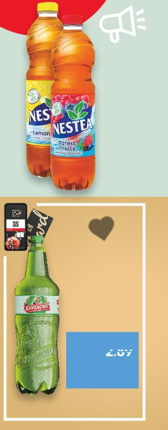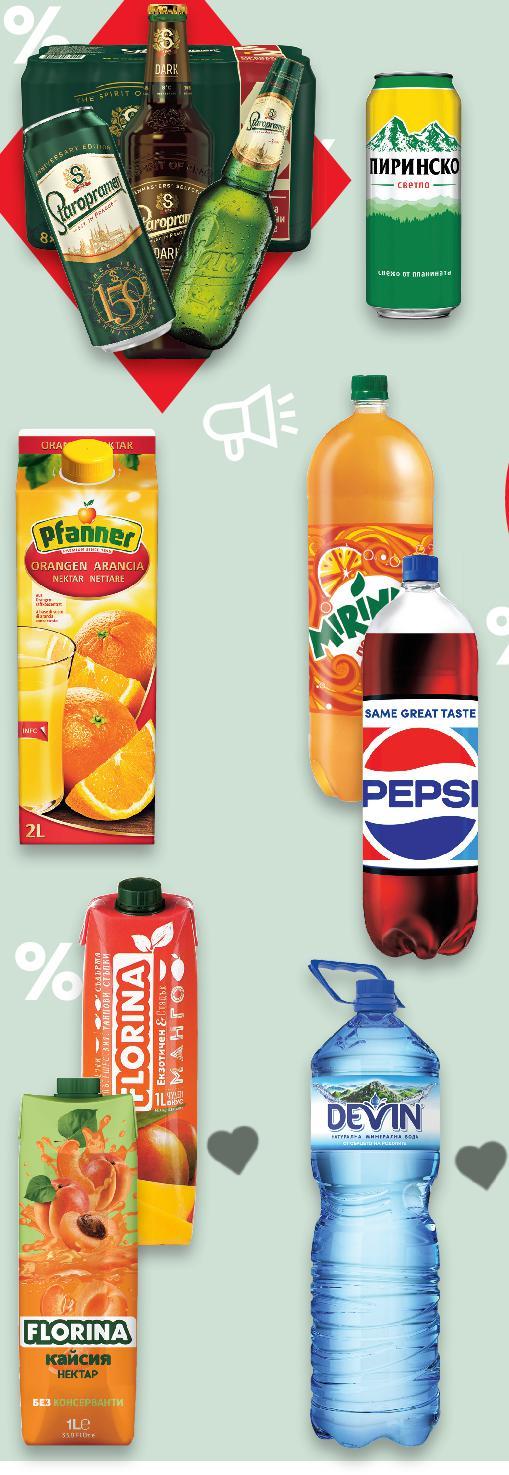 *Със звездичка са обозначени артикулите, които са специално предложение до изчерпване на наличностите. Kaufland не носи отговорност за печатни грешки. СПЕСТИ ДО -34% ОТ ЦЕНАТА -34% 0,95 1,45 -31% 1,09 1,59 -28% 1,99 2,79 -33% 2,19 3,29 -32% 3,49 5,19 само 1,99* -31% 1,99 с2,89 2,89 амо само 2 литрa 2,5 литрa 2 литрa 2,5 литрa -31% 0,95 1,39 -25% ОТСТЪПКА ЗА БИРИ С МАРКА STAROPRAMEN ПИРИНСКО Бира 4,4% vol 0,5 л кен (1 л = 1,90) DEVIN Минерална или изворна вода 2,5 л (1 л = 0,44) FLORINA Сок или Нектар различни вкусове 1 л (1 л = 1,99) NESTEA Студен чай различни вкусове 1,5 л РЕТ (1 л = 1,46) PFANNER Нектар портокал или мултивитамин или Плодова напитка праскова или АСЕ мултивитамин 2 л (1 л = 1,75) БУРГАСКО Бира 4,4% vol 2 л РЕТ (1 л = 1,00) Цена с KAUFLAND CARD PEPSI/ PEPSI MAX/ MIRINDA/ 7 UP Газирана напитка различни видове 2,5 л РЕТ (1 л = 0,80) HELL Енергийна напитка различни видове 0,25 л кен (1 л = 3,80) БЕЗАЛКОХОЛНИ НАПИТКИ И БИРА Отстъпката с Kaufland Card e изчислена спрямо стандартната текуща цена, на която продуктът се предлага в хипермаркета. S29-BG-KW03-LFT-GEP_R-1000-10 29