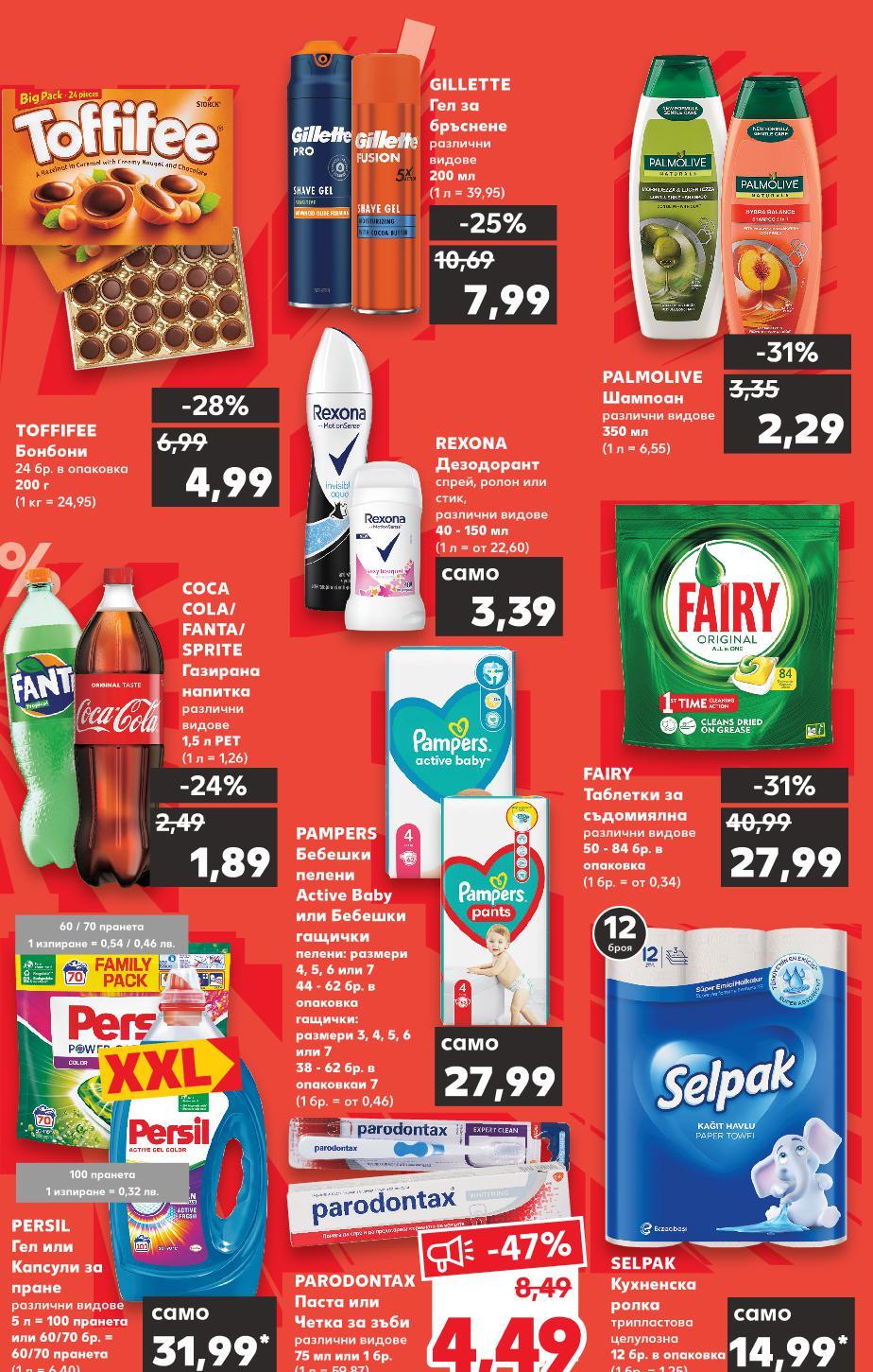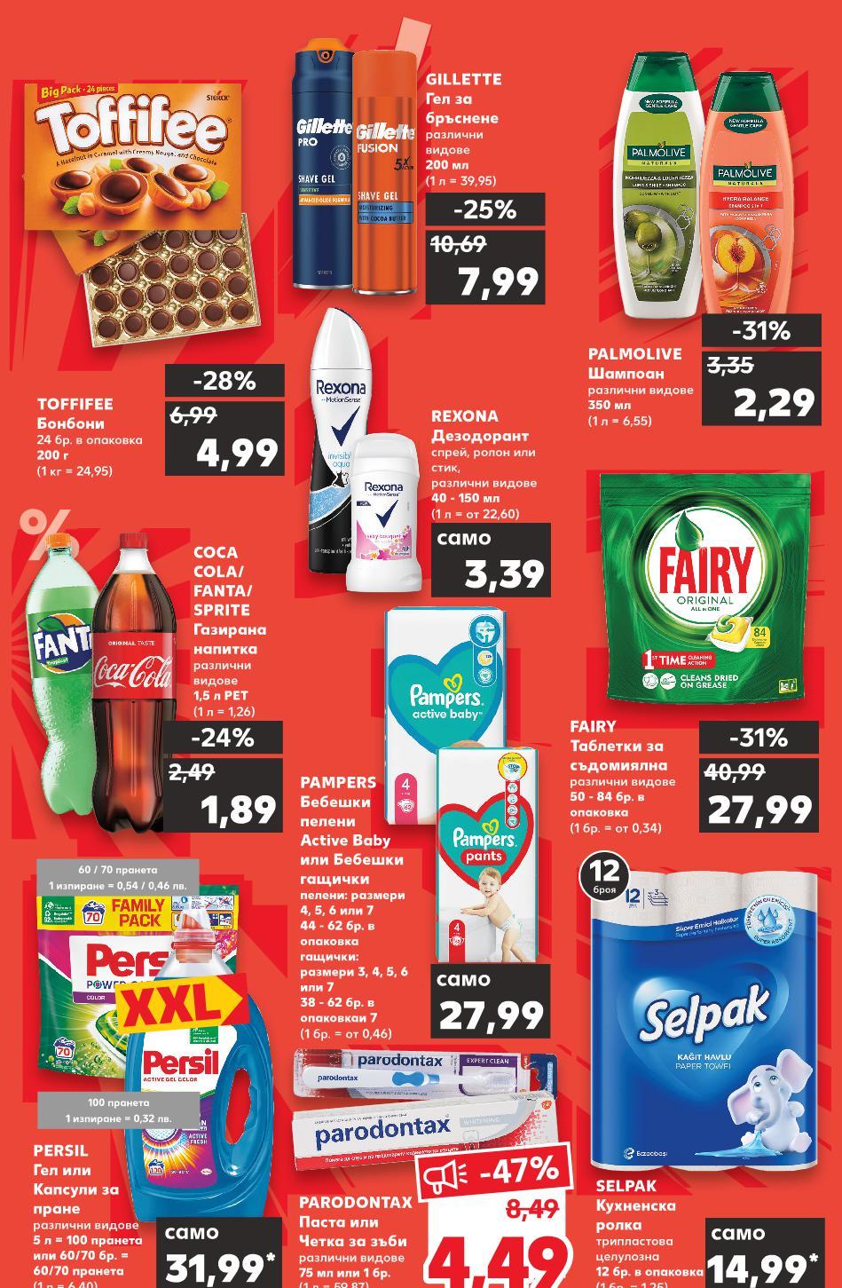 ! *Със звездичка са обозначени артикулите, които са специално предложение до изчерпване на наличностите. Kaufland не носи отговорност за печатни грешки. 14,99* само 3,39 само -24% 1,89 2,49 -31% 2,29 3,35 27,99 само 31,99* само -25% 7,99 10,69 -28% 4,99 6,99 -31% 27,99 40,99 -47% 8,49 4,49 12 броя 100 пранета 1 изпиране = 0,32 лв. 60 / 70 пранета 1 изпиране = 0,54 / 0,46 лв. REXONA Дезодорант спрей, ролон или стик, различни видове 40 - 150 мл (1 л = от 22,60) SELPAK Кухненска ролка трипластова целулозна 12 бр. в опаковка (1 бр. = 1,25) COCA COLA/ FANTA/ SPRITE Газирана напитка различни видове 1,5 л PET (1 л = 1,26) PALMOLIVE Шампоан различни видове 350 мл (1 л = 6,55) PAMPERS Бебешки пелени Active Baby или Бебешки гащички пелени: размери 4, 5, 6 или 7 44 - 62 бр. в опаковка гащички: размери 3, 4, 5, 6 или 7 38 - 62 бр. в опаковкаи 7 (1 бр. = от 0,46) PERSIL Гел или Капсули за пране различни видове 5 л = 100 пранета или 60/70 бр. = 60/70 пранета (1 л = 6,40) GILLETTE Гел за бръснене различни видове 200 мл (1 л = 39,95) TOFFIFEE Бонбони 24 бр. в опаковка 200 г (1 кг = 24,95) FAIRY Таблетки за съдомиялна различни видове 50 - 84 бр. в опаковка (1 бр. = от 0,34) PARОDONTAX Паста или Четка за зъби различни видове 75 мл или 1 бр. (1 л = 59,87) S7-BG-KW03-LFT-TOP_R-1000-10 7