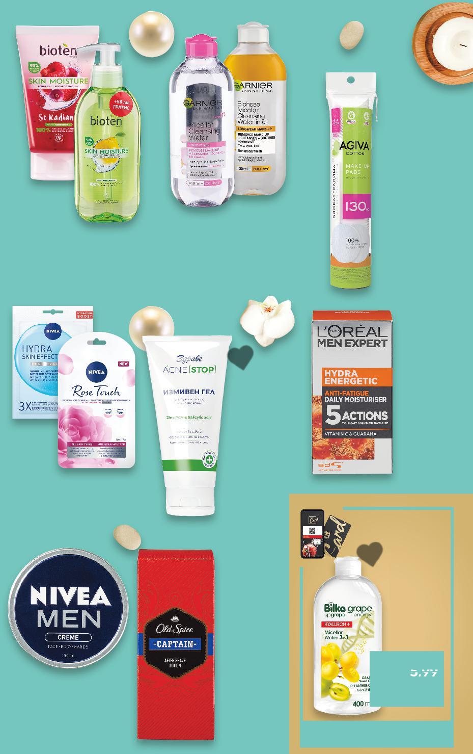Отстъпката с Kaufland Card e изчислена спрямо стандартната текуща цена, на която продуктът се предлага в хипермаркета. *Със звездичка са обозначени артикулите, които са специално предложение до изчерпване на наличностите. Kaufland не носи отговорност за печатни грешки. Отстъпката с Kaufland Card e изчислена спрямо -15% 1,59 1,89 -25% 5,99 7,99 -10% 9,89 10,99 -21% 5,99 7,59 -25% 14,99 19,99 -18% 6,49 7,99 -18% 2,99 3,69 -37% 4,49 7,19 -33% 3,99 с5,99 5,99 амо само AGIVA Тампони за премахване на грим 130 бр. в опаковка (1 бр. = 0,02) GARNIER Мицеларна вода Skin Naturals различни видове 400 мл (1 л = 14,98) OLD SPICE Лосион след бръснене Wolfthorn или Captain 100 мл (1 л = 98,90) NIVEA MEN Крем 150 мл (1 л = 39,94) L‘OREAL MEN EXPERT Крем за лице Hydra Energetic 50 мл (1 л = 299,80) ЗДРАВЕ Измиващ гел за лице Акне Стоп различни видове 150 мл (1 л = 43,27) NIVEA Маска за лице различни видове 1 бр. (1 бр. = 2,99) BIOTEN Измиващ гел или Скраб за лице различни видове 150 - 200 мл (1 л = от 22,45) BILKA Мицеларна вода Grape Energy 3в1 400 мл (1 л = 9,98) Цена с KAUFLAND CARD S31-BG-KW03-LFT-SPA_R-1000-10 31