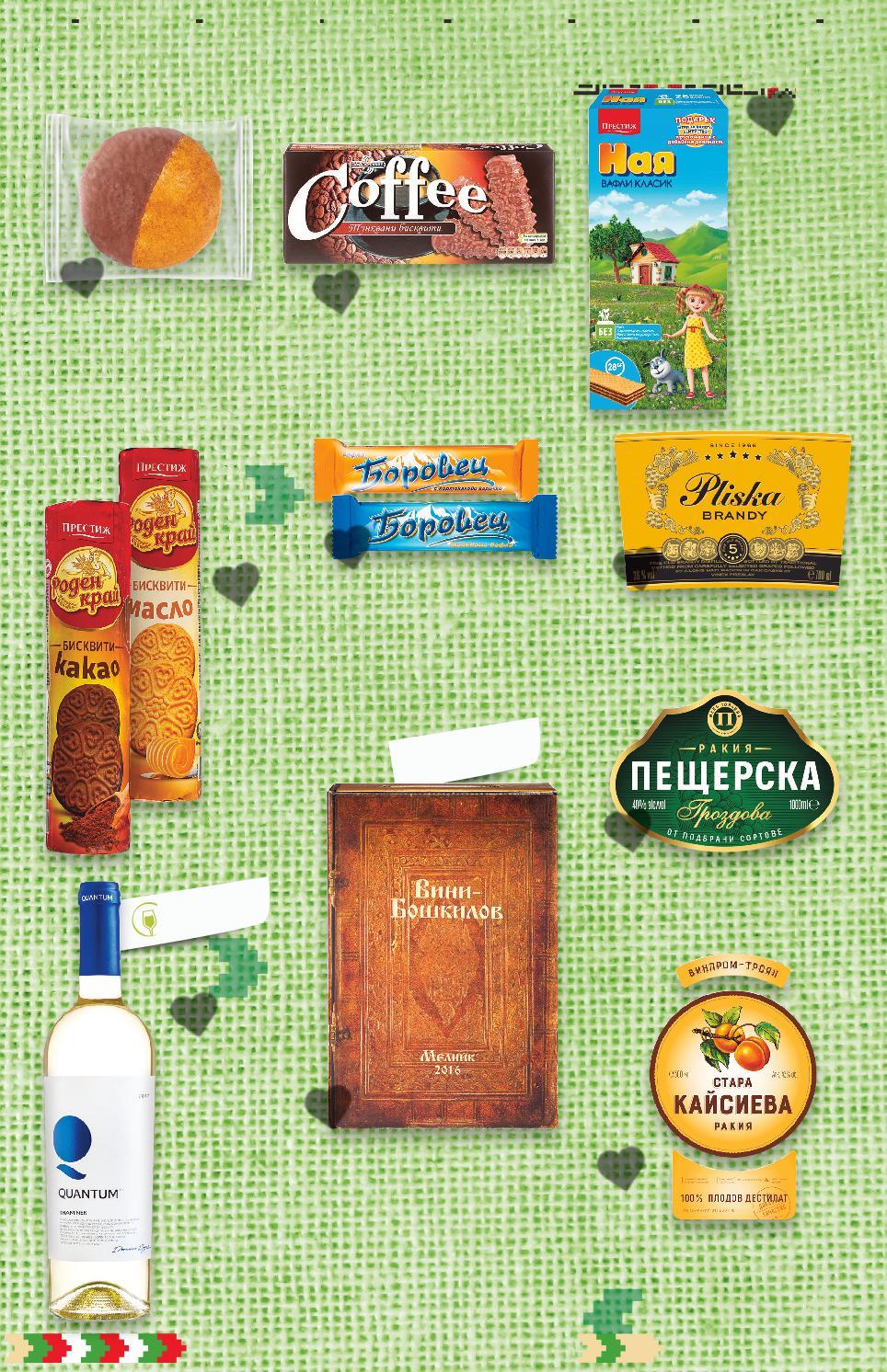 *Със звездичка са обозначени артикулите, които са специално предложение до изчерпване на наличностите. Kaufland не носи отговорност за печатни грешки. Интензивен плодоваромат Ароматна Агранадилаикиви ромат на -31% 1,99 2,89 -22% 0,69 0,89 -25% 12,99 17,39 -27% 7,99 10,99 -26% 13,99 18,99 -31% 1,29 1,89 -28% 4,29 5,99 -33% 0,46 0,69 -20% 11,99 14,99 -33% 9,99 14,99 3 литра 1 литър SWEET PLUS Бисквити Coffee, My Story или Масленки 140 - 165 г (1 кг = от 12,07) BG LINE Меденка Ретро с кафява или бяла глазура 70 г (1 кг = 9,86) ПЕЩЕРСКА Гроздова ракия 40% vol 1 л (1 л = 12,99) QUANTUM Червено, бяло вино или розе различни сортове Произход: България, Тракийска низина 0,75 л (1 л = 10,66) Ракия стара кайсиева, прасковена, ябълкова отлежала или крушова Williams 42% vol 0,5 л (1 л = 27,98) ПРЕСТИЖ Бисквити Роден край с масло, с мляко или с какао 165 - 170 г (1 кг = до 7,82) НАЯ Вафли класик, какао или мляко с какао 28 бр. в опаковка 600 - 653 г (1 кг = от 6,57) БОРОВЕЦ Вафла с какаова глазура или с портокалови корички 52 - 55 г (1 кг = от 8,37) PLISKA Бренди 40% vol 0,7 л (1 л = 17,13) ВИНИ БОШКИЛОВ Червено вино различни сортове Произход: България, долината на р. Струма 3 л BIB (1 л = 3,33) S5-BG-KW03-LFT-BG2_R-1000-10 5