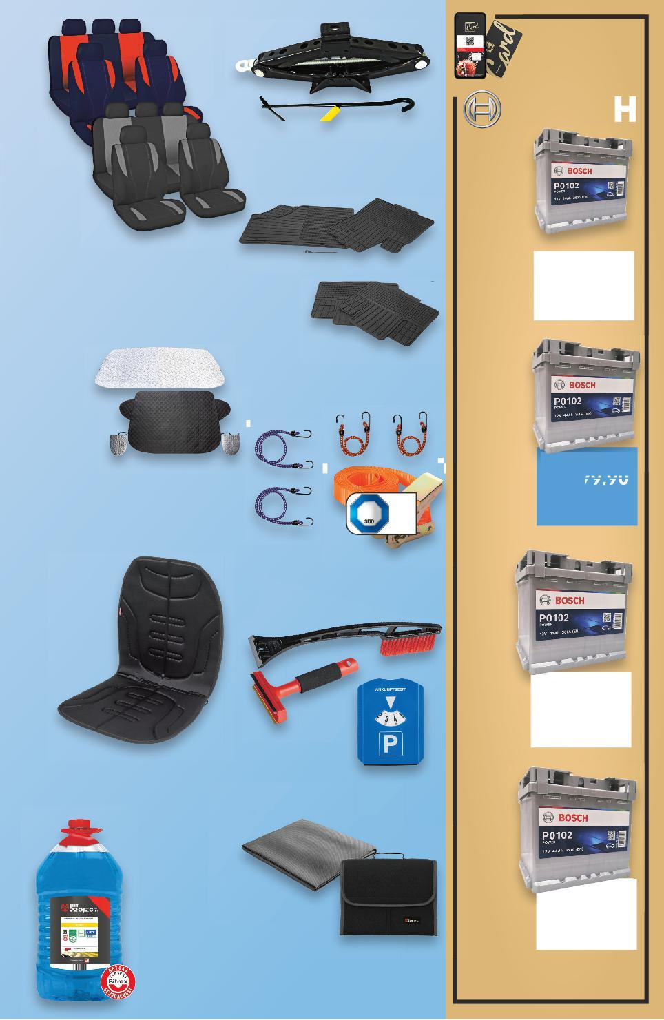 Отстъпката с Kaufland Card e изчислена спрямо стандартната текуща цена, на която продуктът се предлага в хипермаркета. *Със звездичка са обозначени артикулите, които са специално предложение до изчерпване на наличностите. Kaufland не носи отговорност за печатни грешки. 3,99* само -20% 11,99 14,99 24,99* само 7,99* само 34,99* само 34,99* само 12,99* само 19,99 само -20% 119,90 149,90 само -21% 219,90 279,90 амо само 79,90 -22% 169,90 219,90 само -22% 139,90 179,90 само 8 части 4 части -40% 12,99 21,99 5 литра MY PROJECT Стъргалка за лед различни видове, 1 бр. MY PROJECT Термозащитно фолио за предно стъкло 4-слойно, предпазва от замръзване през зимата и от напичане през лятото, с допълнителни капаци за външните огледала MY PROJECT Комплект автостелки универсални, противоплъзгащи елементи, възможност за изрязване в желан размер, 69 x 45 см, 60 х 46 см и 2 х 46 х 38 см MY PROJECT Подгряваща седалка за автомобил USB захранване MY PROJECT Колани за багаж различни видове AUTO PRACTIC Механичен крик натоварване до 1 тон MY PROJECT Калъфи за автомобилни седалки със заден джоб, универсални, сиво/черно или червено/черно MY PROJECT Органайзер за багажник 35 x 19 x 29 см или 50 x 21 x 16 см натоварване до 9 кг или Подложка 100 x 120 см Акумулатор Power 44 AH 360A Акумулатор Power 74 AH 680A Акумулатор Power 65 AH 540A Акумулатор Power 55 AH 460A Цена с KAUFLAND CARD Цена с KAUFLAND CARD Цена с KAUFLAND CARD Цена с KAUFLAND CARD MY PROJECT Зимна течност за чистачки до -30° C S45-BG-KW03-LFT-NFP1_R-1000-10 45