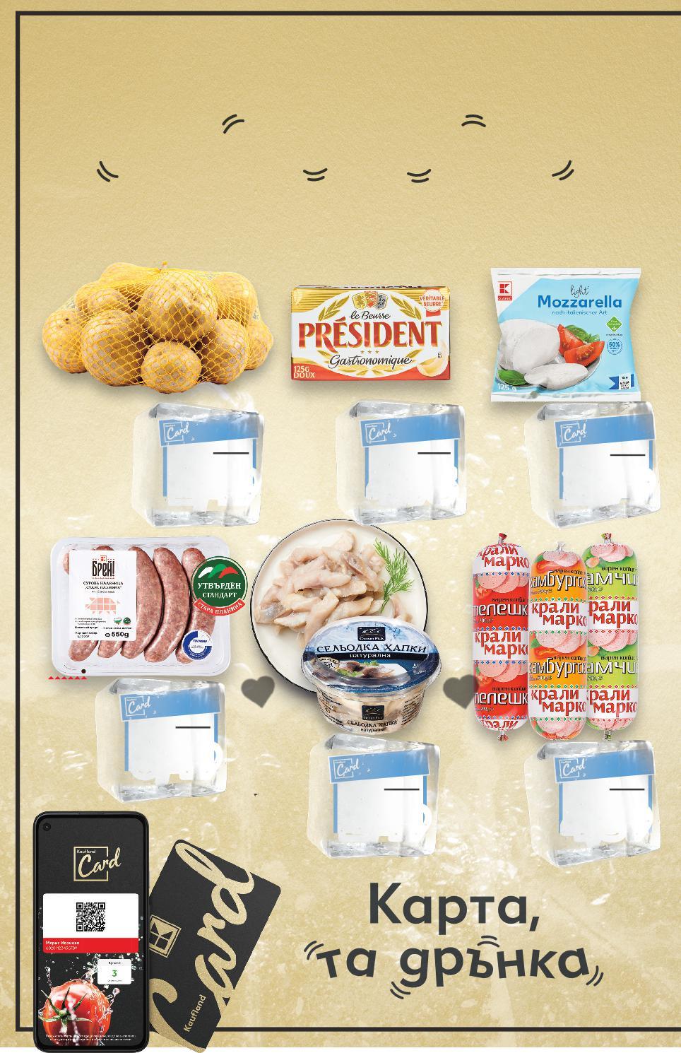 Цените са валидни за посочените на последна страница хипермаркети. Стоките се продават в количества, обичайни за едно домакинство. Всички цени са в лева с включен ДДС. Всички артикули се предлагат без декорация. Снимките са примерни. ПАДАТ И ЦЕНИТЕ П и температурите падат, НАД 200 ПО-НИСКИ ЦЕНИ през целия януари с Kaufland Card --с с с с КРАЛИ МАРКО Салам Телешки, Хамбургски или Камчия 700 г (1 кг = 6,56) СЕЛЬОДКА хапки натурална, розова, маринована 150 г (1 кг = 16,60) PRESIDENT Краве масло 125 г (1 кг = 39,60) Моцарела лайт 27% 125 г (1 кг = 22,32) Четкани картофи Клас: I 2,5 кг мрежа (1 кг = 1,00) Цена с KAUFLAND CARD Цена с KAUFLAND CARD Цена с KAUFLAND CARD Цена с KAUFLAND CARD Цена с KAUFLAND CARD с г кг = с 2,5 кг с с Сурова наденица стандарт „Стара планина“ 550 г (1 кг = 11,80) Цена с KAUFLAND CARD Намаляваме през януари 2023 г. цените с Kaufland Card на над 200 артикула. Отстъпката с Kaufland Card e изчислена спрямо стандартната текуща цена, на която продуктът се предлага в хипермаркета. S8-BG-KW03-LFT-PREIS_L-1000-10 8