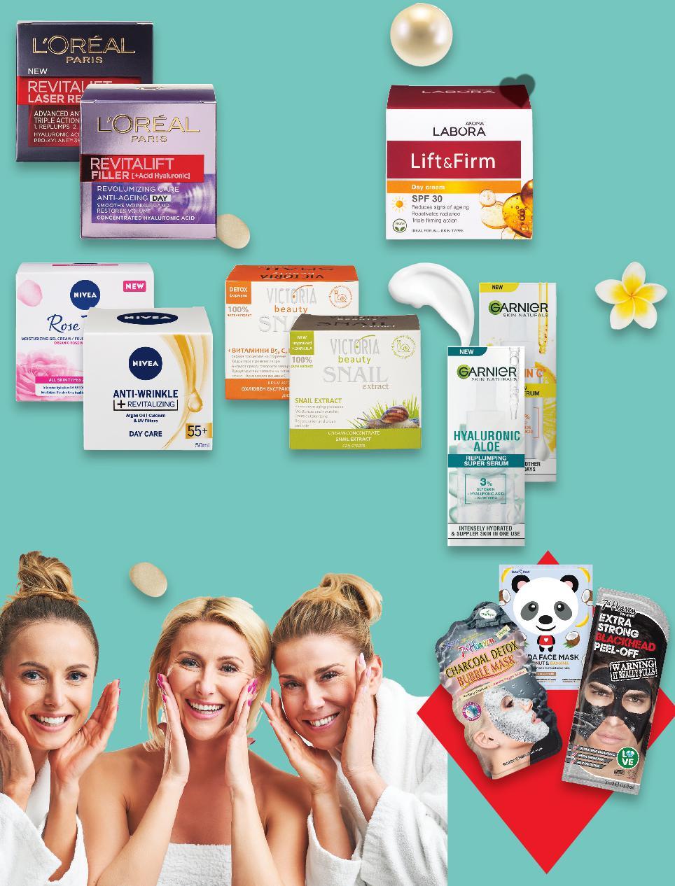 Цените са валидни за посочените на последна страница хипермаркети. Стоките се продават в количества, обичайни за едно домакинство. Всички цени са в лева с включен ДДС. Всички артикули се предлагат без декорация. Снимките са примерни. -30% ОТСТЪПКА ЗА ВСИЧКИ МАСКИ ЗА ЛИЦЕ С МАРКА 7TH HEAVEN ИЗГОДНА ГРИЖА ЗА ЛИЦЕ КОЗМЕТИЧНИ ПРОДУКТА ЩЕ НАМЕРИШ ПРИ НАС НАД 2400 -29% 21,99 30,99 -25% 14,99 19,99 -25% 8,99 11,99 -10% 4,39 4,89 -19% 9,99 12,35 L‘OREAL REVITALIFT Крем за лице дневен или нощен или Околоочен крем 15 - 50 мл (1 л = от 439,80) GARNIER Серум за лице Skin Naturals Hyaluronic Aloe или Vitamin C 30 мл (1 л = 499,67) VICTORIA BEAUTY Крем за лице Snail различни видове 50 мл (1 л = 179,80) NIVEA Крем за лице дневен или нощен различни видове 50 мл (1 л = 199,80) LABORA Крем или Серум дневен, нощен или околоочен, различни видове, 15 - 50 мл (1 л = от 87,80) КОЗМЕТИКА S30-BG-KW03-LFT-SPA_L-1000-10 30