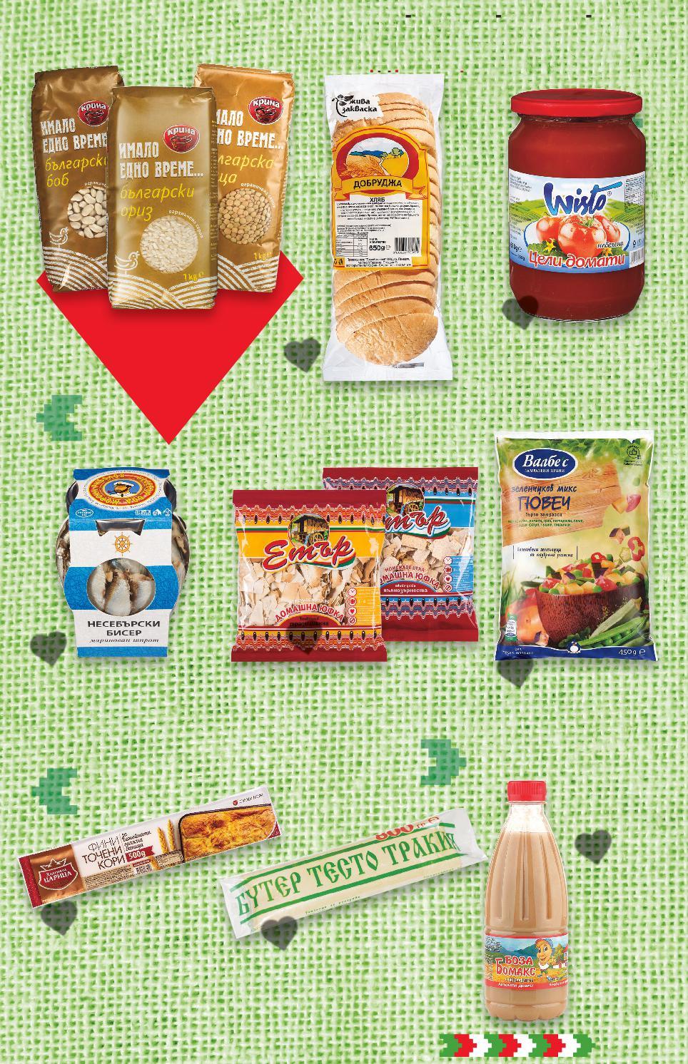 Цените са валидни за посочените на последна страница хипермаркети. Стоките се продават в количества, обичайни за едно домакинство. Всички цени са в лева с включен ДДС. Всички артикули се предлагат без декорация. Снимките са примерни. -25% ОТСТЪПКА ЗА ПРОДУКТИ ИМАЛО ЕДНО ВРЕМЕ -28% 0,75 1,05 -30% 1,59 2,29 -30% 2,79 3,99 -25% 2,99 3,99 -20% 0,99 1,24 -33% 0,99 1,49 -12% 2,79 3,19 -23% 1,99 2,59 БОМАКС Боза 500 мл (1 л = 1,50) ВАЛБЕС Гювеч замразен 450 г (1 кг = 3,54) ТРАКИЯ Бутертесто замразено 800 г (1 кг = 3,49) ЗЛАТНАТА ЦАРИЦА Фини точени кори 500 г (1 кг = 5,98) Хляб Добруджа нарязан жива закваска 650 г (1 кг = 1,53) ЕТЪР Домашна юфка традиционна или пълнозърнеста 200 г (1 кг = 4,95) НЕСЕБЪРСКИ БИСЕР Мариновани шпроти 290 г (1 кг = 9,63) WISTO Домати цели небелени 680 г (1 кг = 2,93) БЪЛГАРСКИ ПРОДУКТИ S4-BG-KW03-LFT-BG2_L-1000-10 4