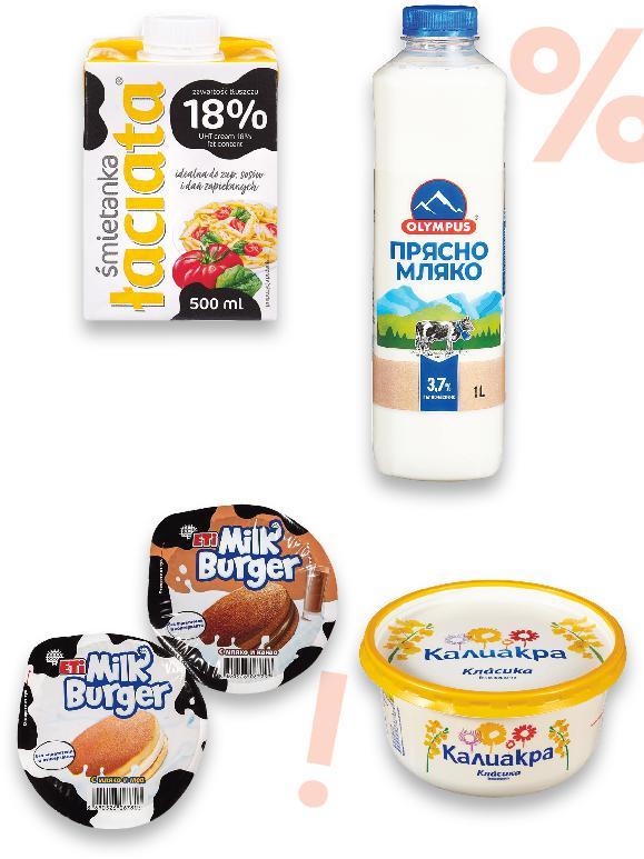 Отстъпката с Kaufland Card e изчислена спрямо стандартната текуща цена, на която продуктът се предлага в хипермаркета. *Със звездичка са обозначени артикулите, които са специално предложение до изчерпване на наличностите. Kaufland не носи отговорност за печатни грешки. -32% 3,39 4,99 -12% 1,45 1,65 -35% 2,99 4,65 -28% 0,75 1,05 -20% 3,19 3,99 3,49* само -37% 2,99 4,75 -30% 1,99 2,85 само -27% 5,49 7,55 МЛЕЧНИ И РАСТИТЕЛНИ ПРОДУКТИ БАЛКАН Заквасена сметана 20% масленост 400 г (1 кг = 8,48) ДОМЛЯН Кисело мляко 2% масленост 500 г (1 кг = 2,90) КАЛИАКРА Продукт за мазане Класика или с вкус на масло 450 г (1 кг = 6,65) ETI Милк бургер с млечен крем с мед, ягода или какао 35 г (1 кг = 21,43) OLYMPUS Прясно мляко 3,7% масленост 1 л (1 л = 3,19) EXQUISA Кварк Fitline с вкус на печени бадеми или ябълка и канела 400 г (1 кг = 8,73) ДИМИТЪР МАДЖАРОВ Извара 350 г (1 кг = 8,55) DANONE Млечен продукт с протеин YoPRO различни видове 160 г (1 кг = 12,44) Цена с KAUFLAND CARD LACIATА Сметана за готвене 18% масленост 500 г (1 кг = 10,98) S17-BG-KW03-LFT-BED2_R-1000-10 17
